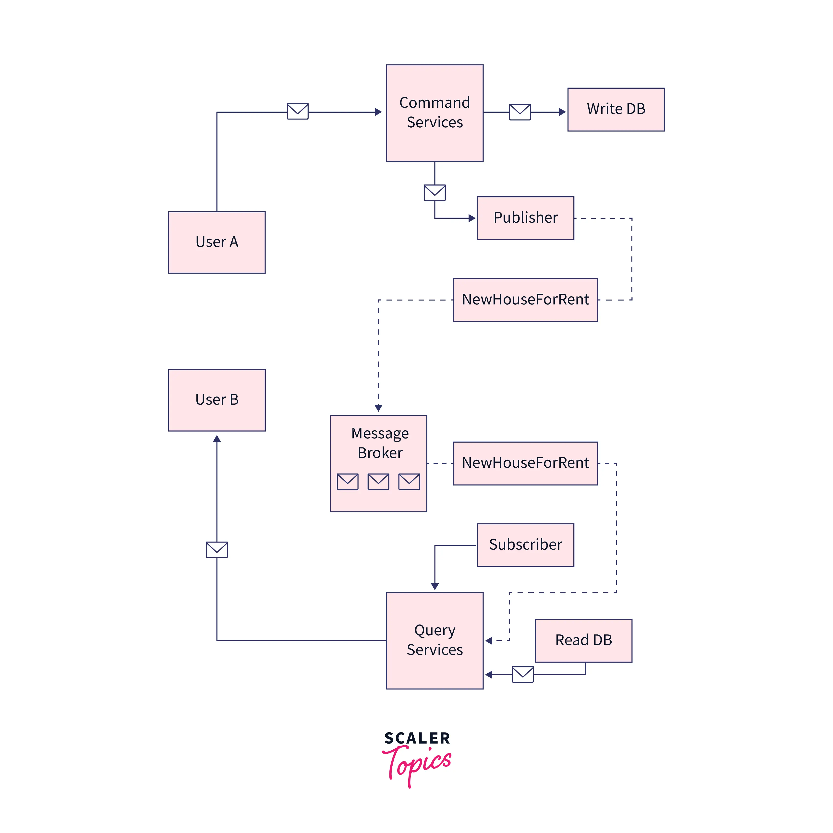 Explanation: Here, User A makes a write query to the command service. Command service has 2 tasks to fulfill, i.e, make a write to the Write Database, and also publish a message into the queue to the Topic named as NewHouseForRent, so that this message is picked by the respective subscribers, which in this case is Query Service. After getting this message, the query service makes a written request to the Read Database, so that the information gets synchronized between the Read and the Write Database. User B makes a read query to the Query Service, which gets served the synchronized Read Database.