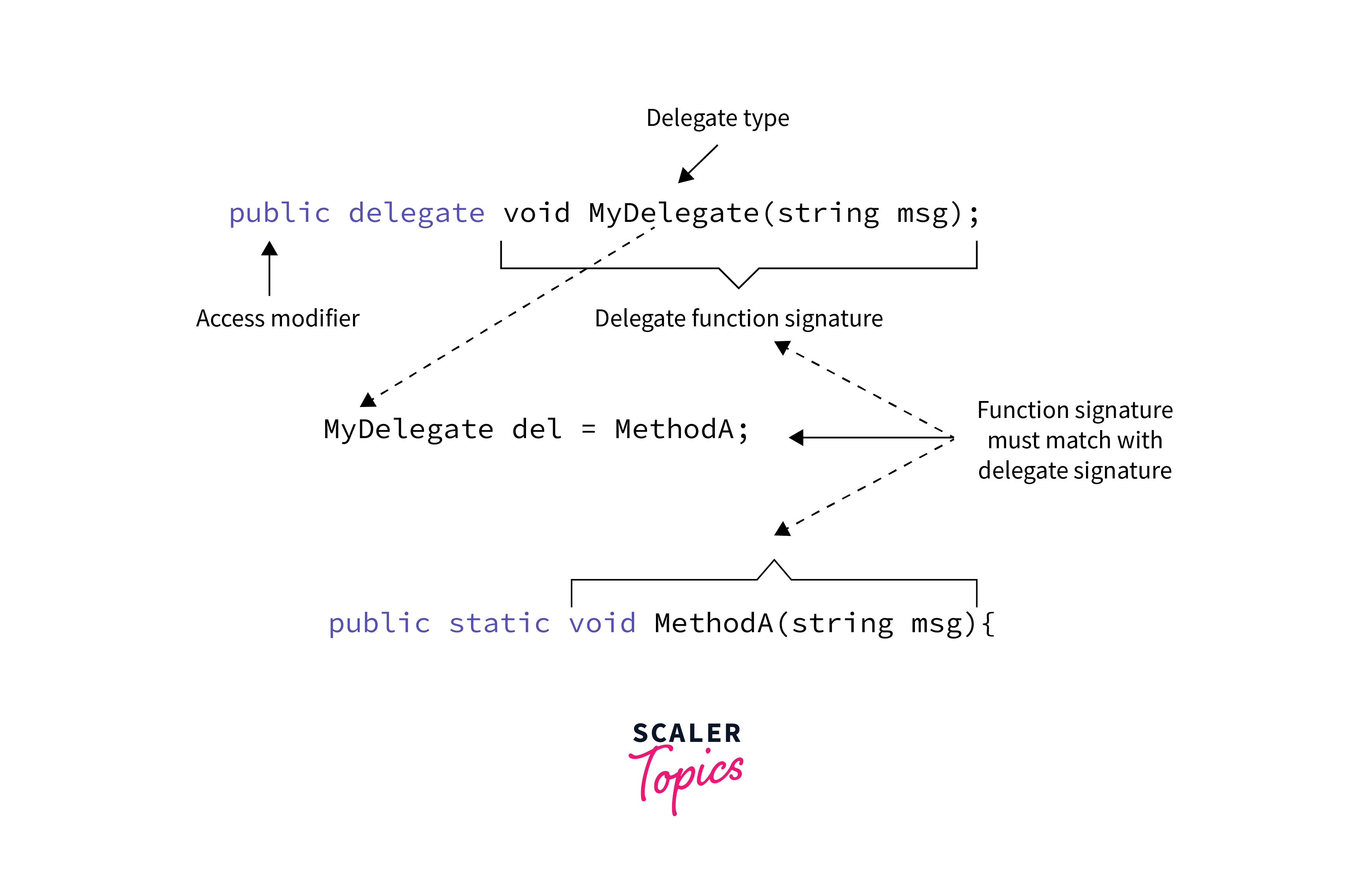 - Delegate type MyDelegateType is declared, taking an integer parameter and returning void.