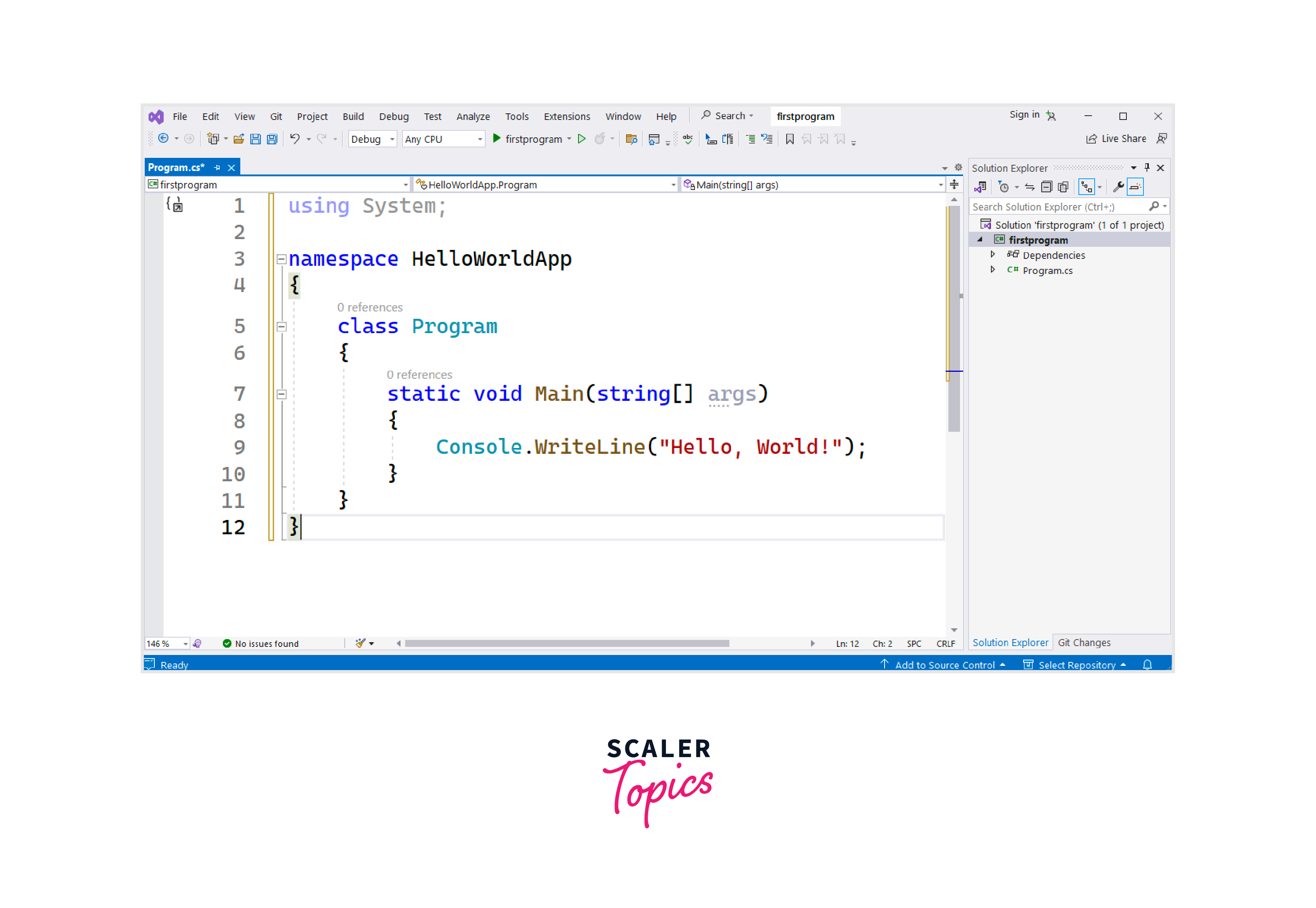 Write Your Code: Inside Program.cs, you'll see a Main method. This method is the starting point for your program. Replace the existing code with the following "Hello, World!" example: