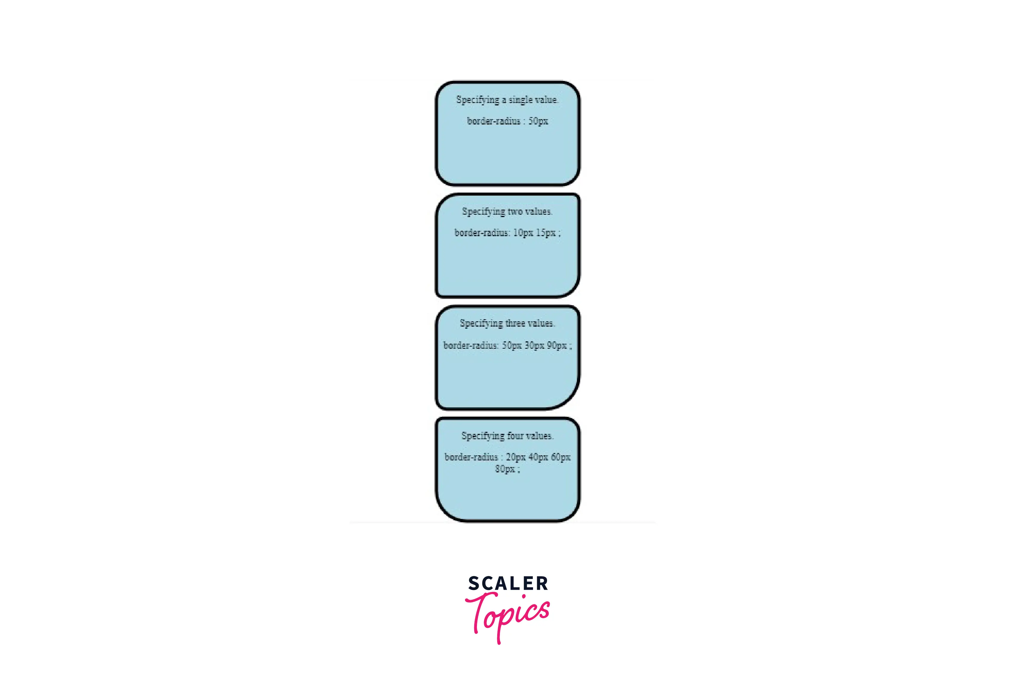 - We can specify two values. The first value sets the top-left and bottom-right corners, while the other applies to the top-right and bottom-left corners.