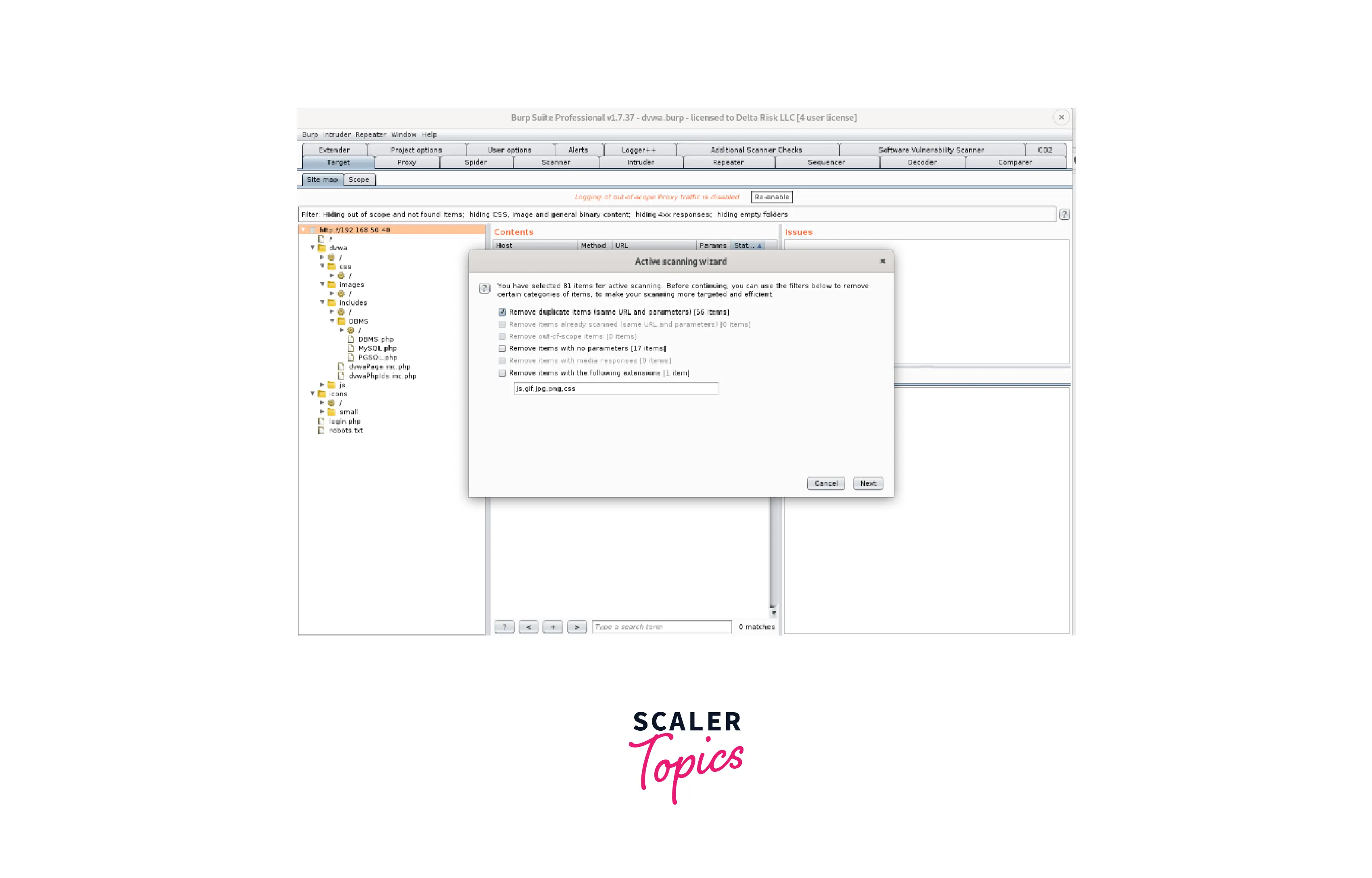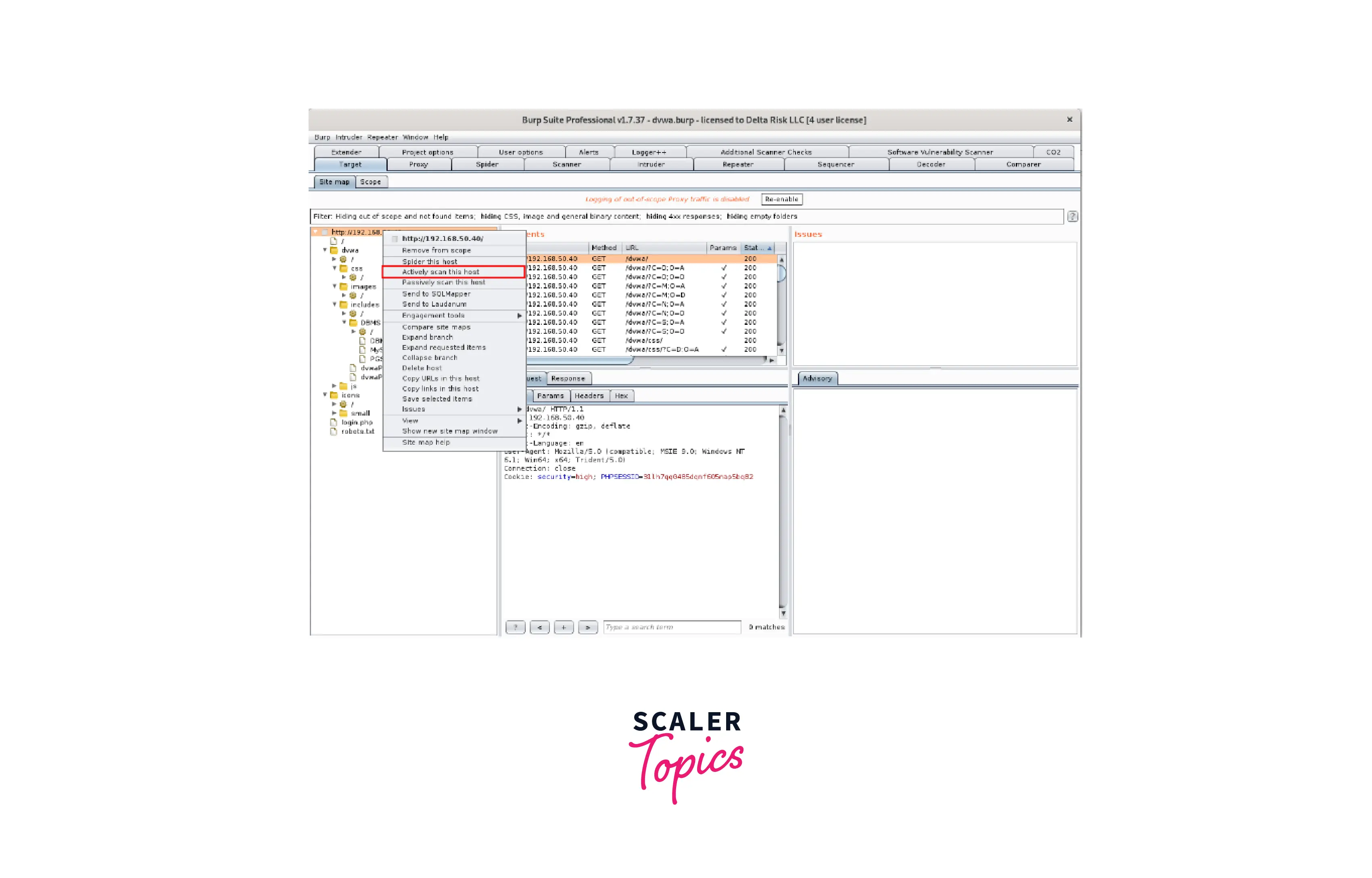 You may use this page to manually navigate through the pages and features that were found during the spidering process. You may browse the pages to see the GET and POST information as well as the requests and answers delivered through Burp. - The final step will be to actively scan the sitemap that Burp indicated. This will look for potential flaws and exploits in the chosen application using the fantastic Burp scanning engine as well as the enhancements we've provided. To achieve this, choose "Actively scan this host" from the context menu when you right-click the sitemap's root.