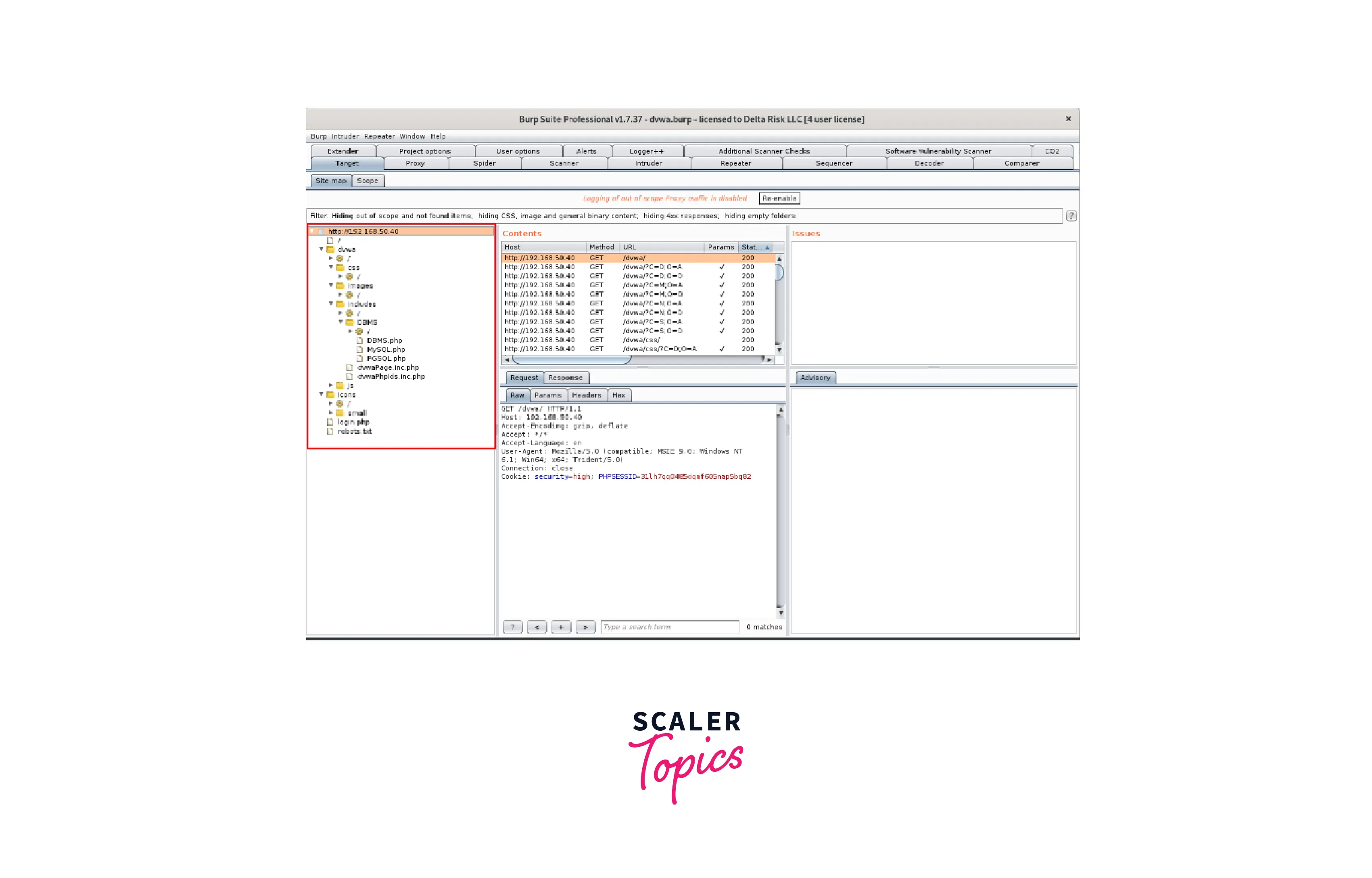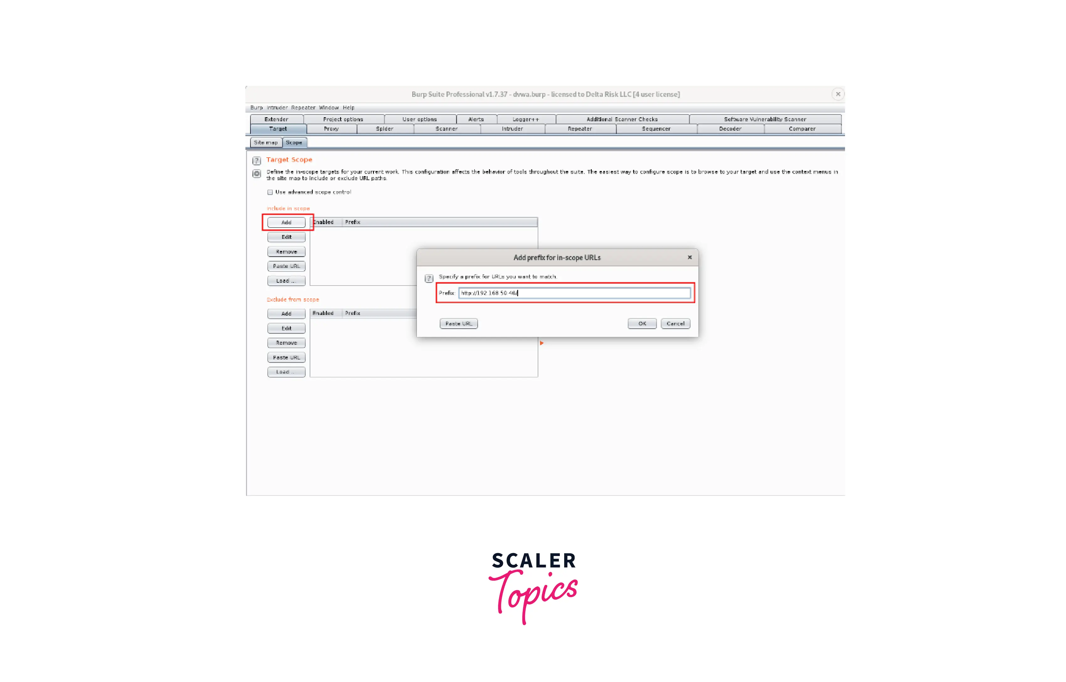 - Burp requires the website to be added to the target scope before any web application testing can begin. Get this DVWA included in our scope. You may accomplish the following by going under the Target tab: Target -> Scope -> Add.