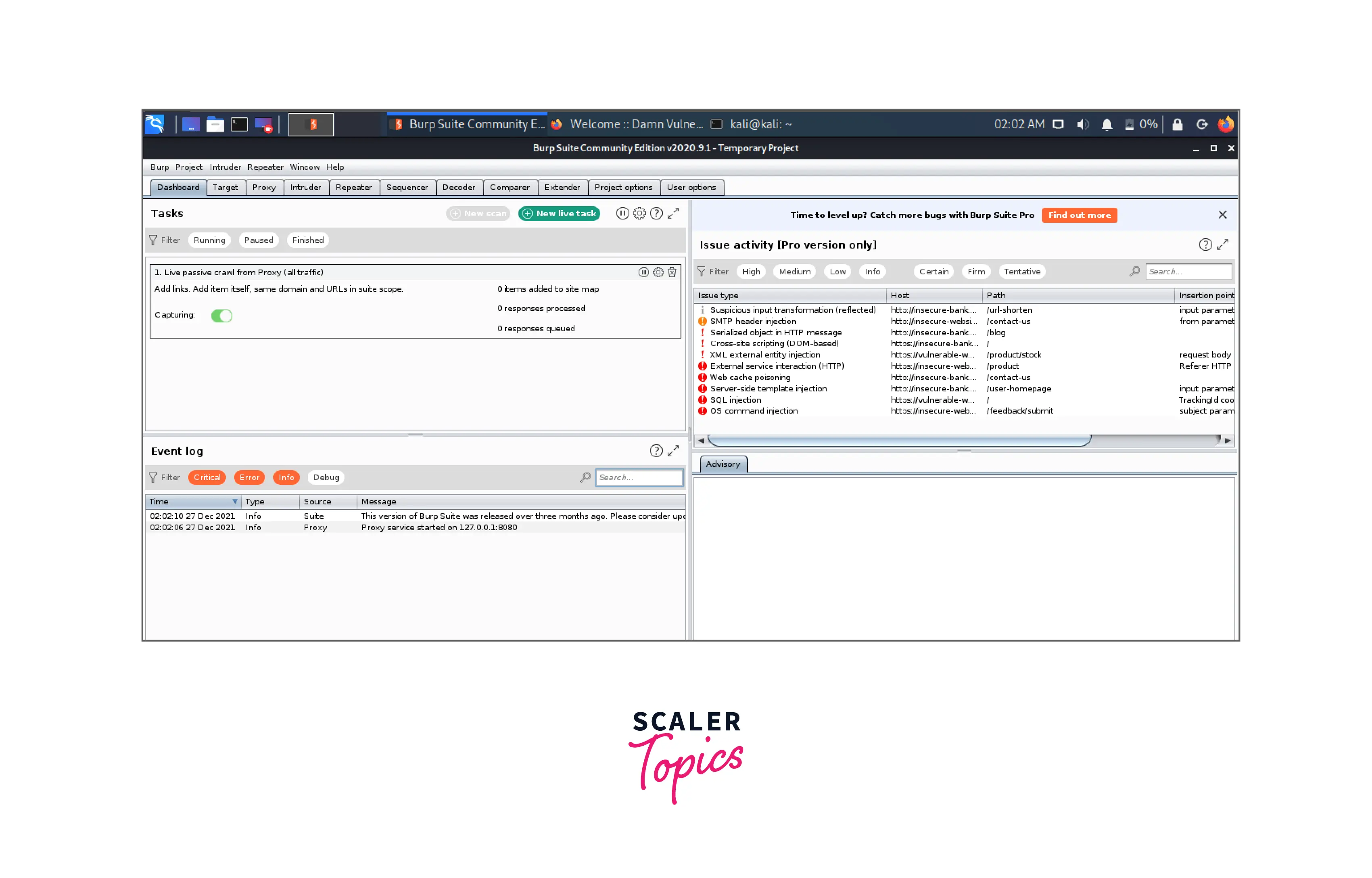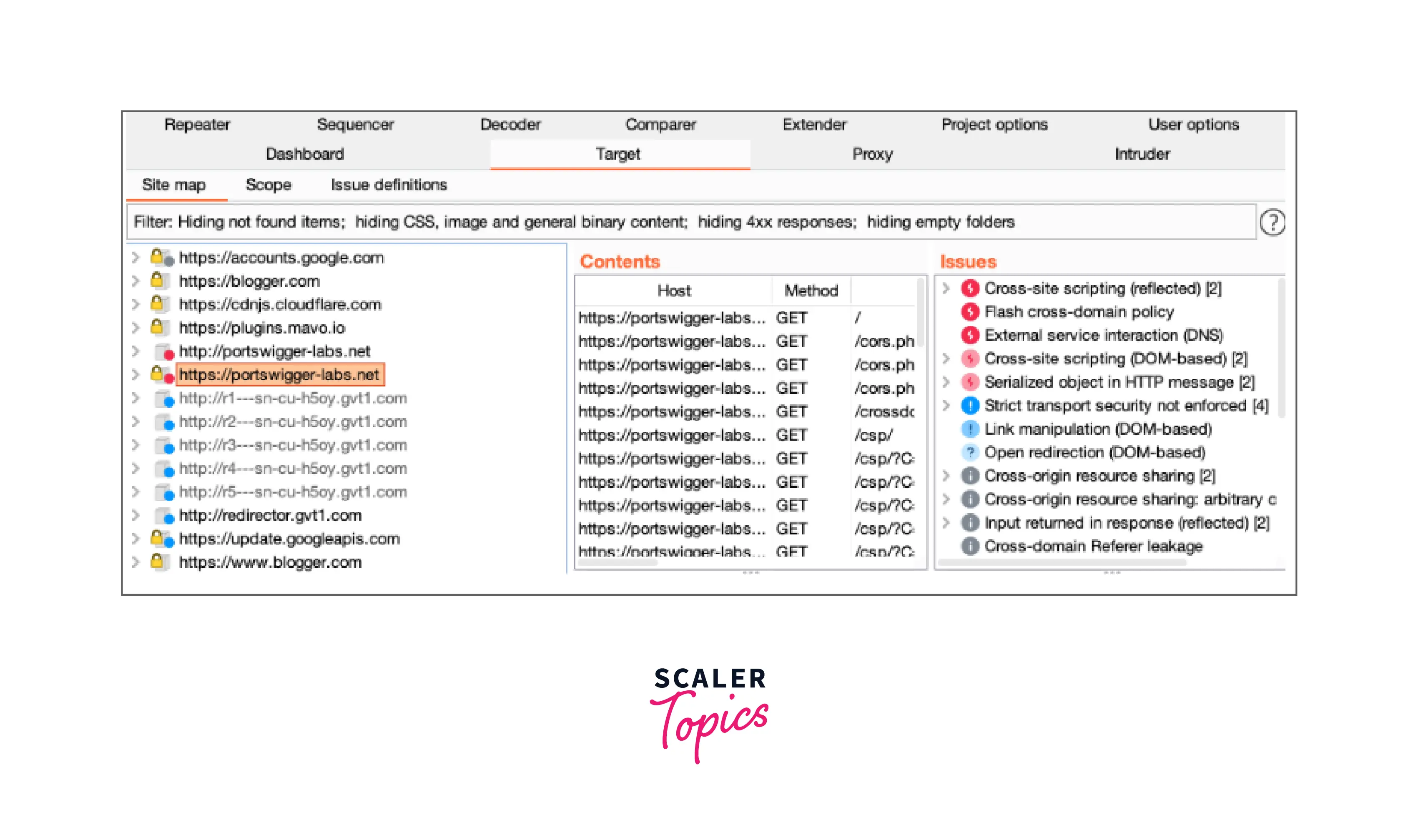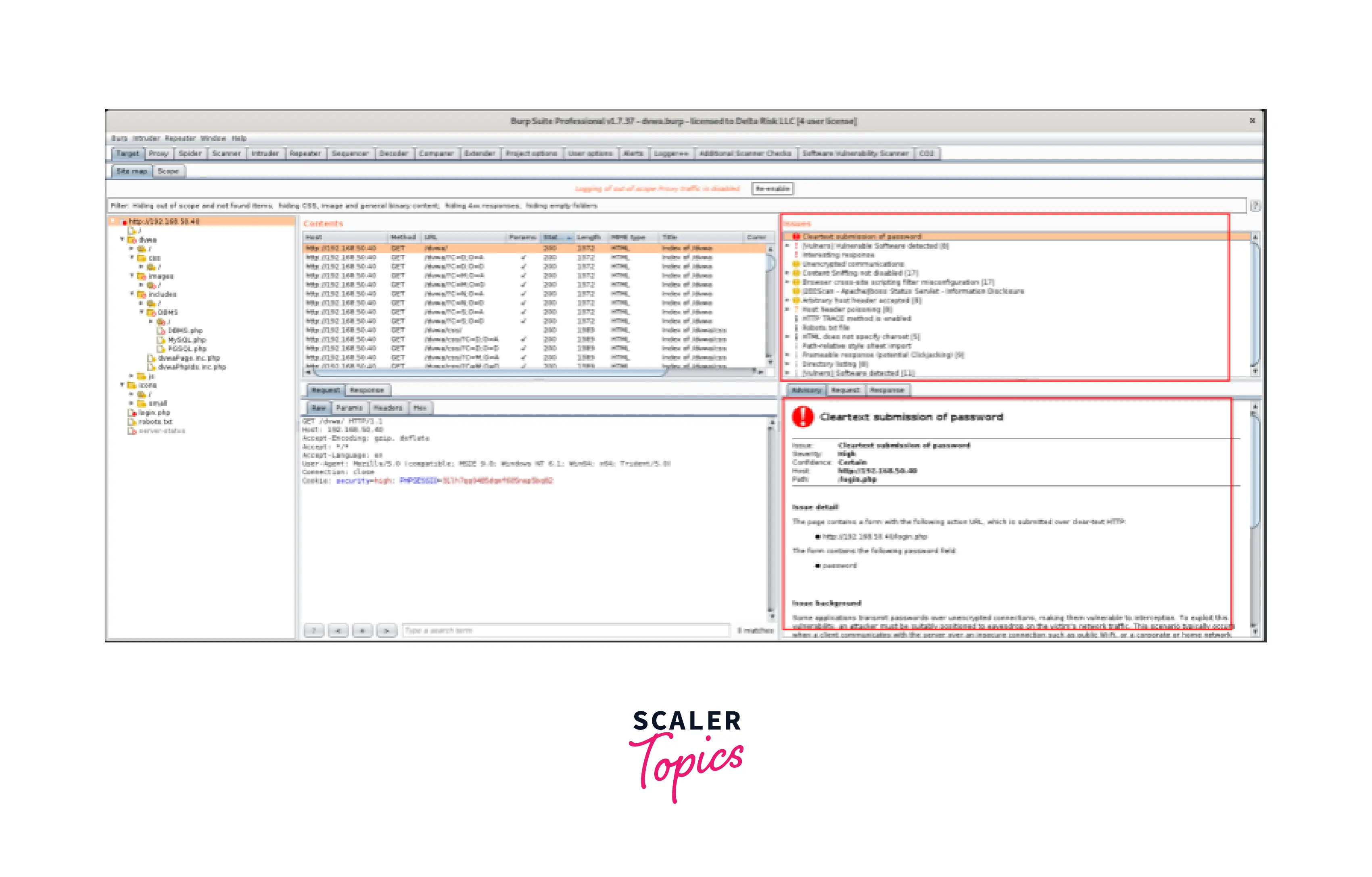 Here, the color of the alert next to the issues indicates the severity of the concerns, which may be seen. In this instance, the "cleartext submission of password" is rated as "high." During the scanning phase, Burp can frequently produce a large number of false positives, therefore manual confirmation of important discoveries is required.