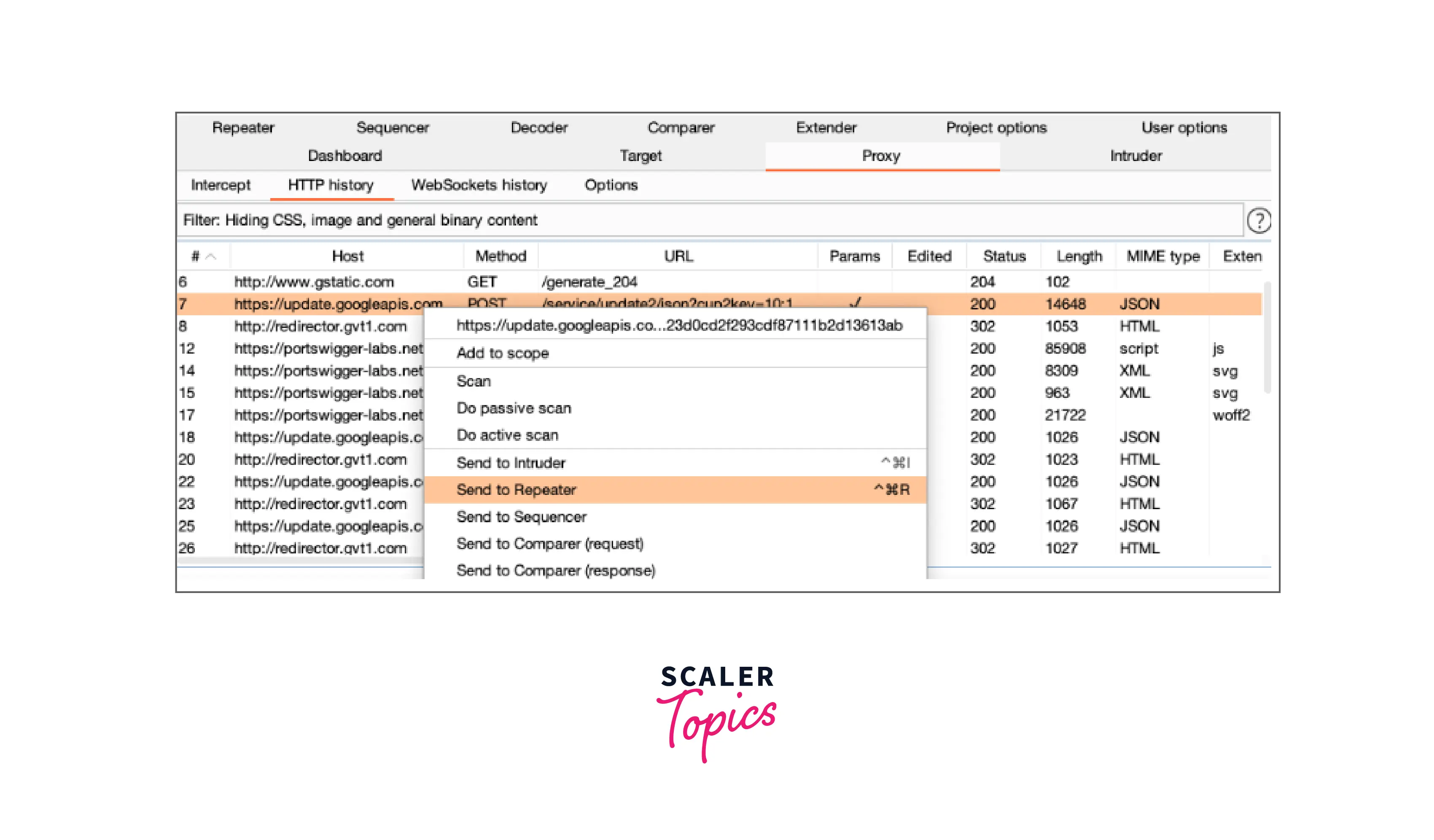 Sending messages is possible from the Proxy > Intercept, HTTP history, and Site Map tabs as well as from wherever else in Burp where HTTP messages are shown. To accomplish this, choose one or more messages, and then transmit the request to another tool using the context menu.