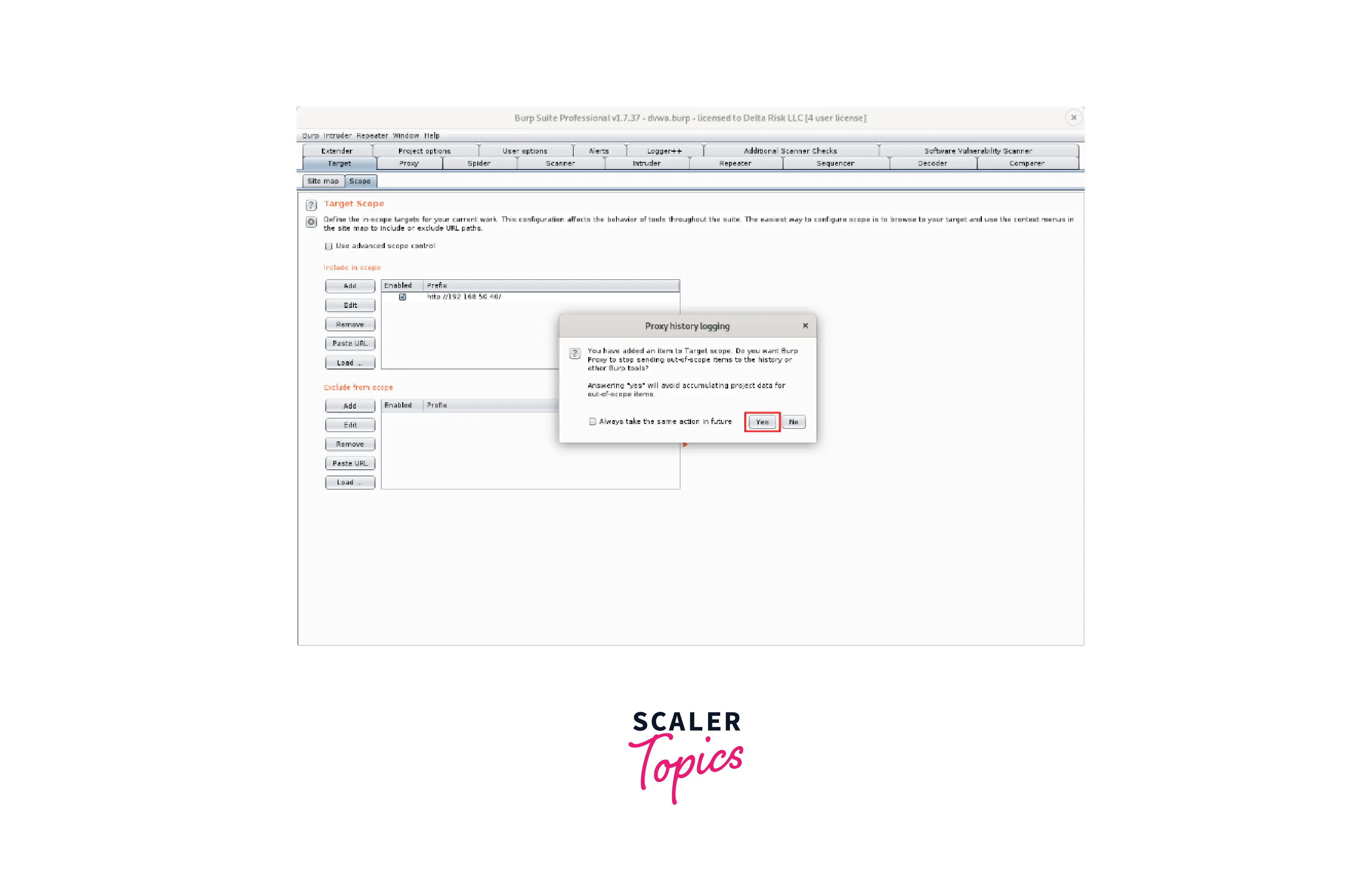 - Burp will ask you if you want to cease transmitting items that are beyond the scope of the target once you have added it successfully to history or other Burp tools. By choosing "Yes" on this question, you may keep your Burp project within reasonable bounds and prevent any out-of-scope requests from being carried out automatically.