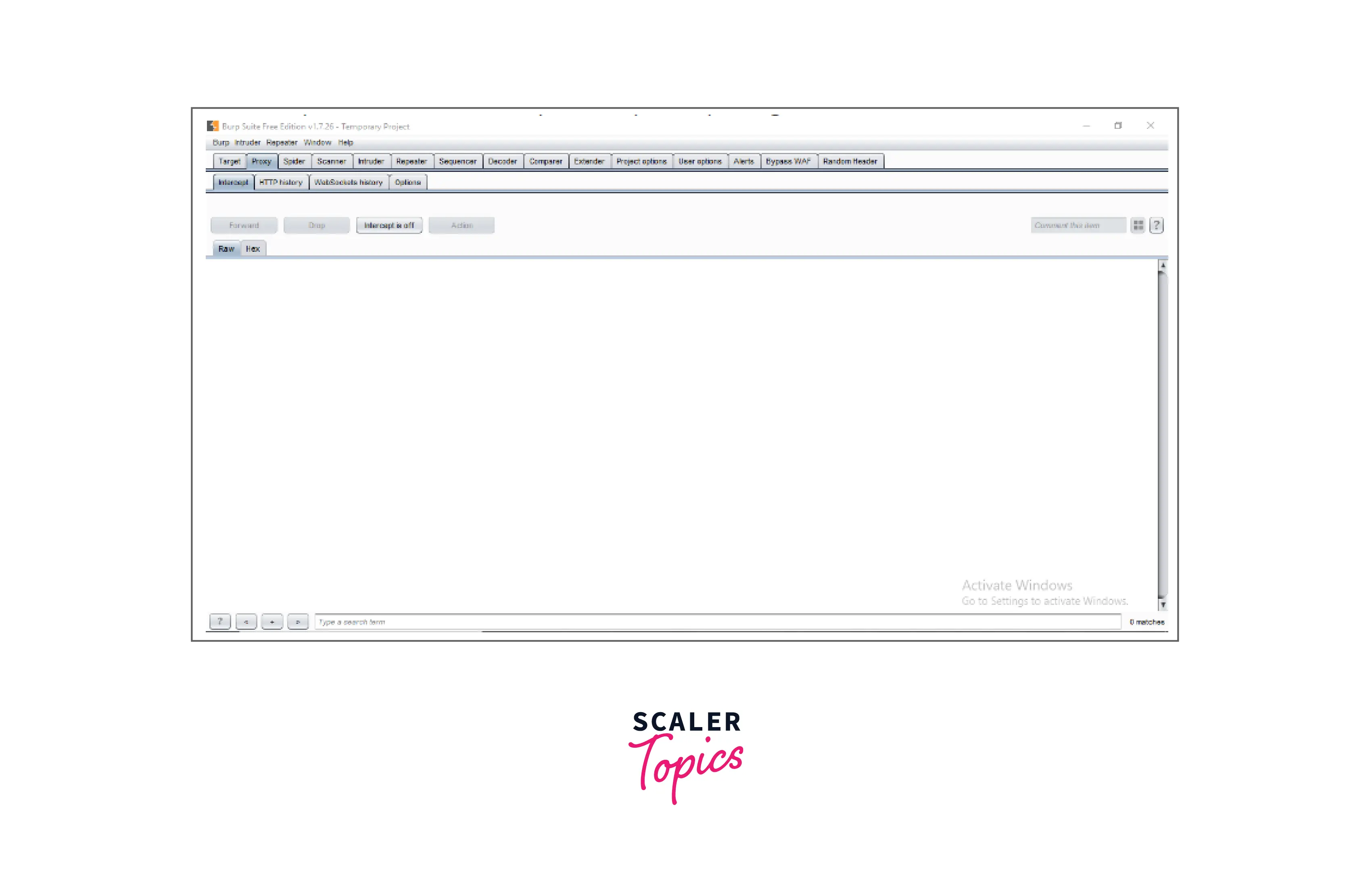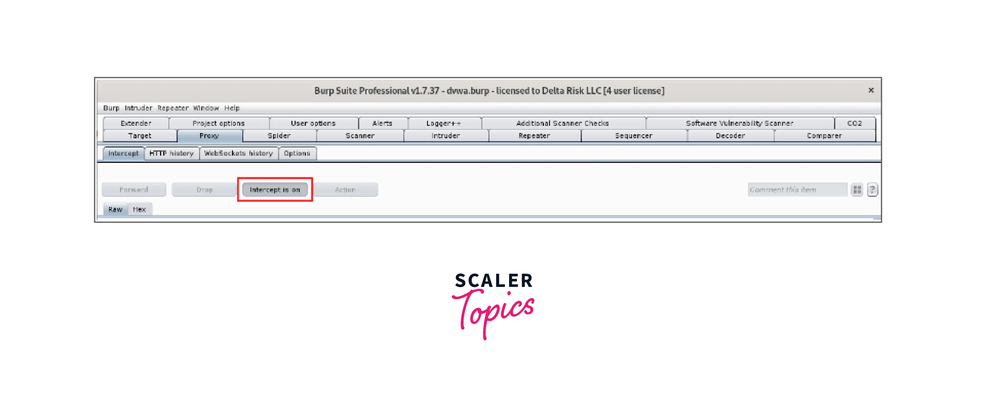 - Then, in Burp Suite, we choose the proxy tab and select the intercept is off button to activate it.