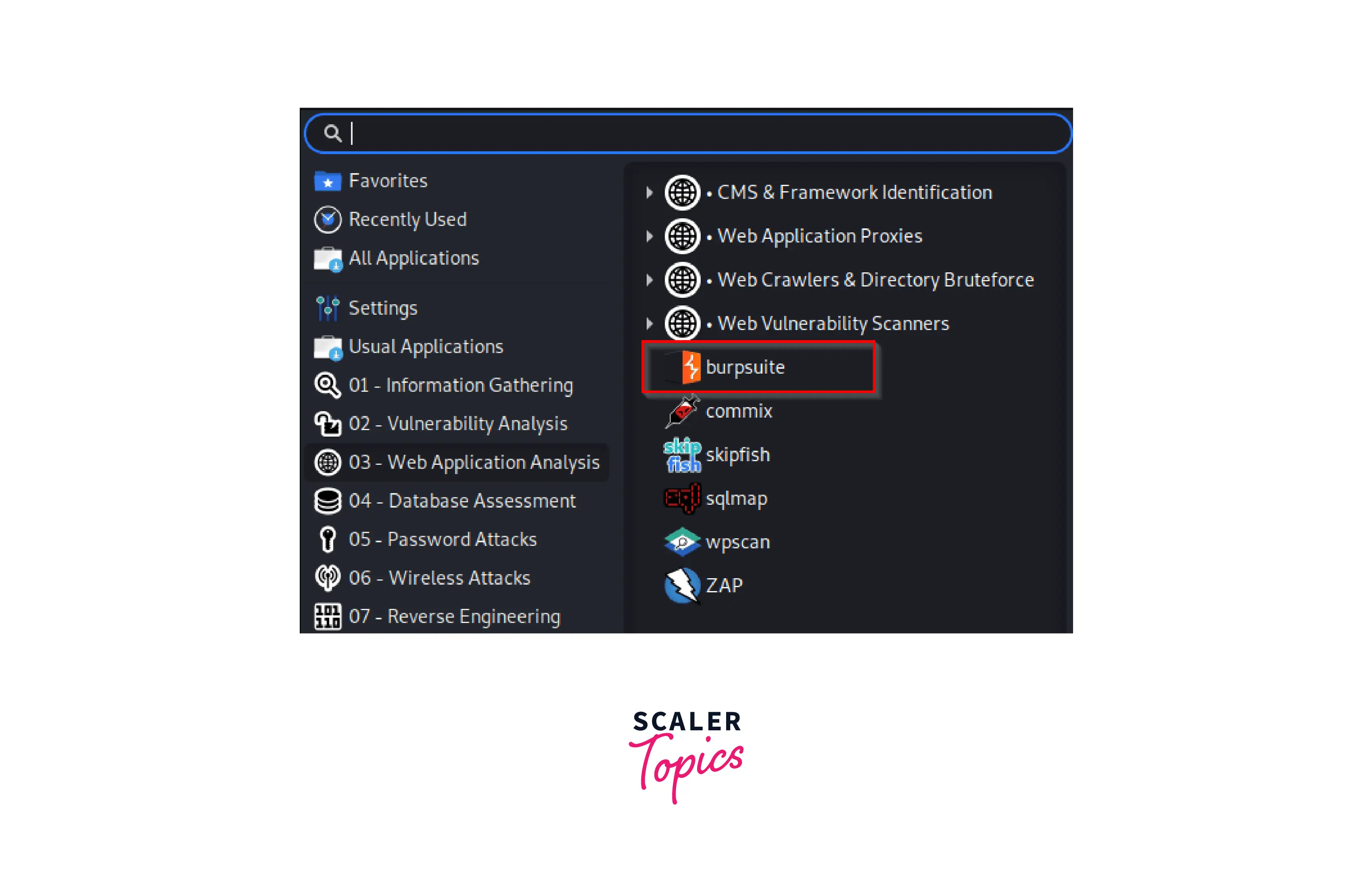 - After that, we launch Burp Suite. On Kali Linux, you may find it under the program's panel.