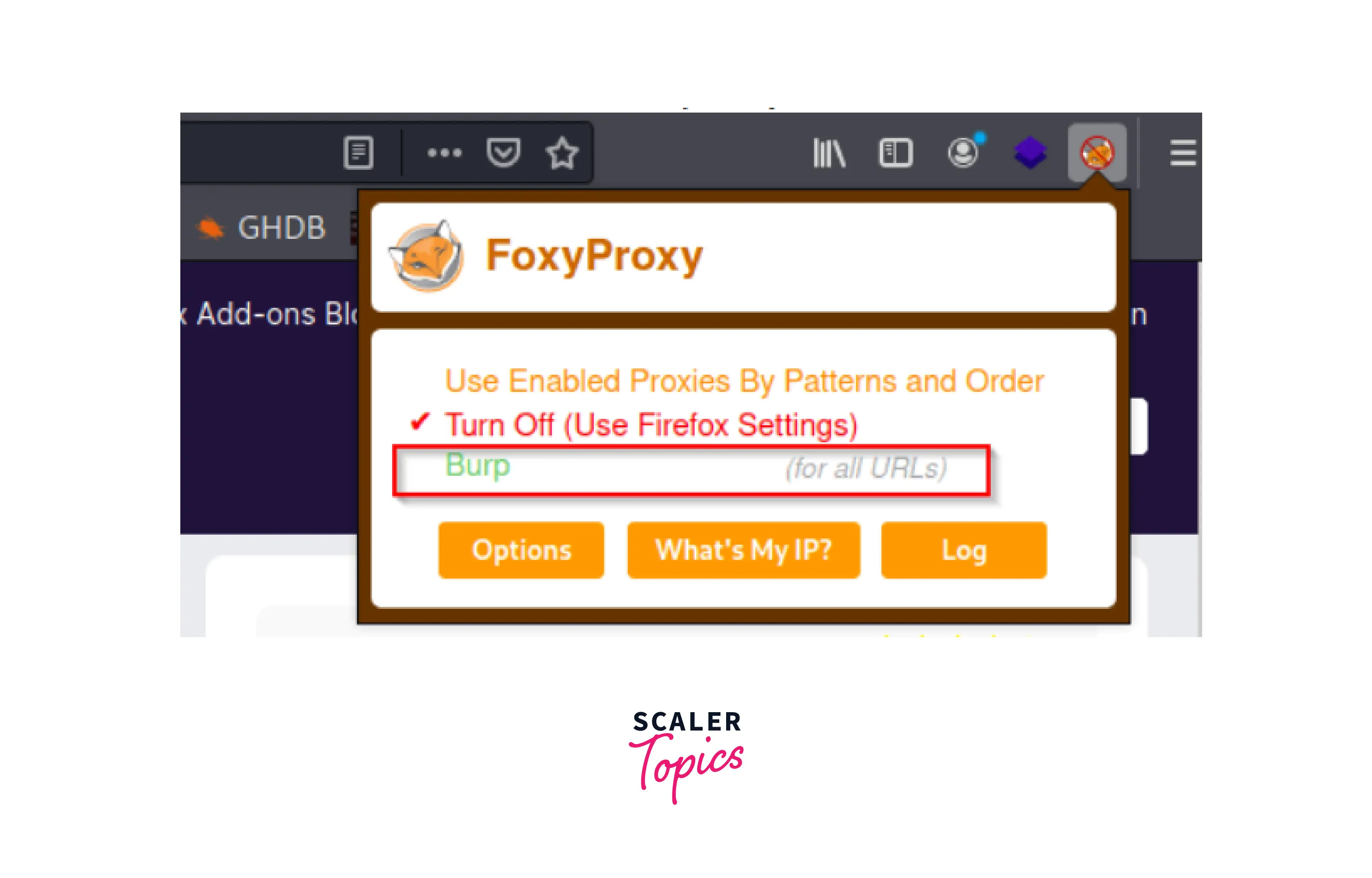 - To start our proxy, we must first ensure that the foxy proxy is running by clicking the fox icon in our browser, followed by Burpsuite: