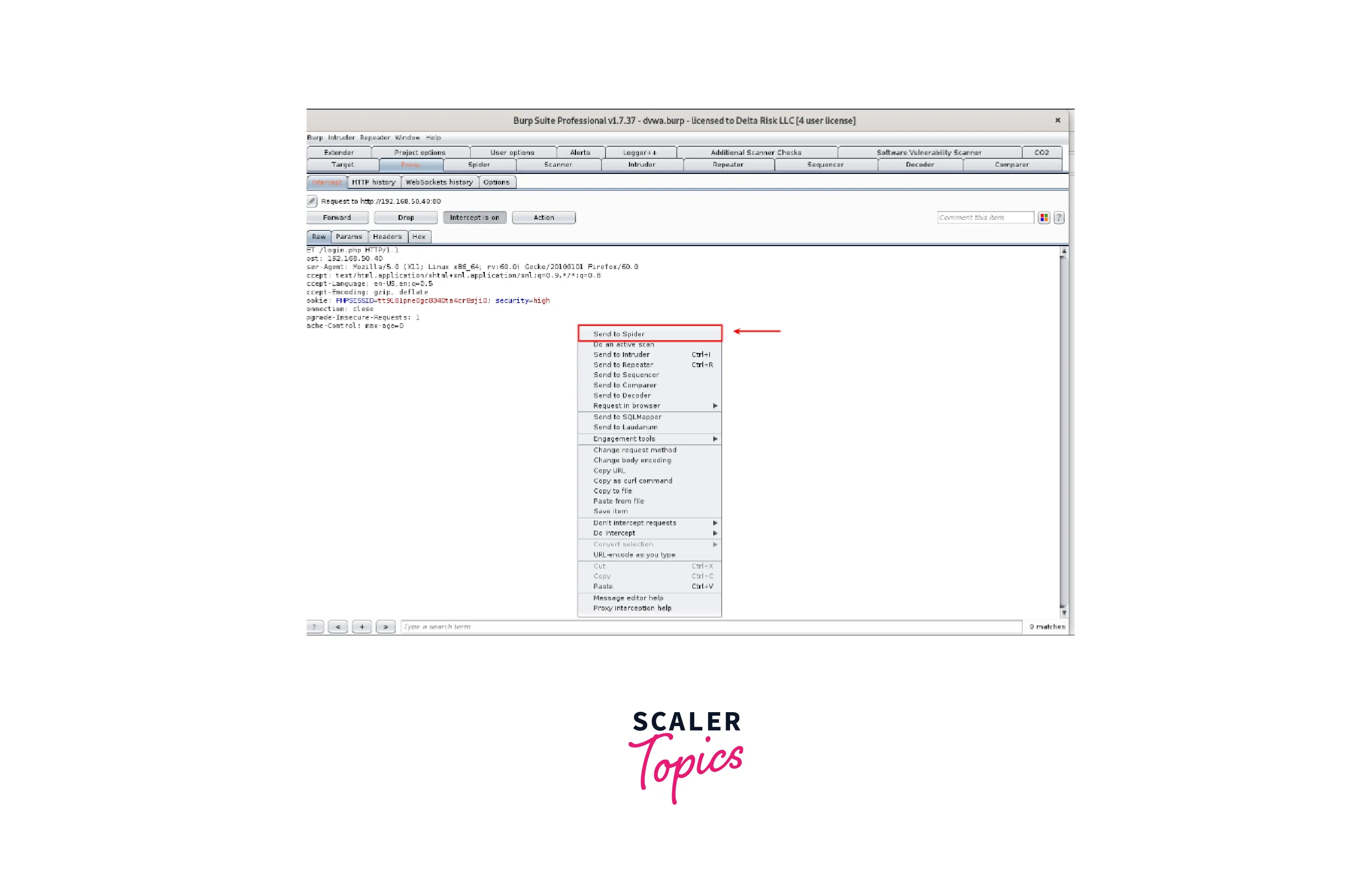 - The request has now been effectively recorded. From here, we may take on a variety of various activities. We're going to right-click on the "Intercept" screen and choose to send to Spider with the application already selected as our target scope.