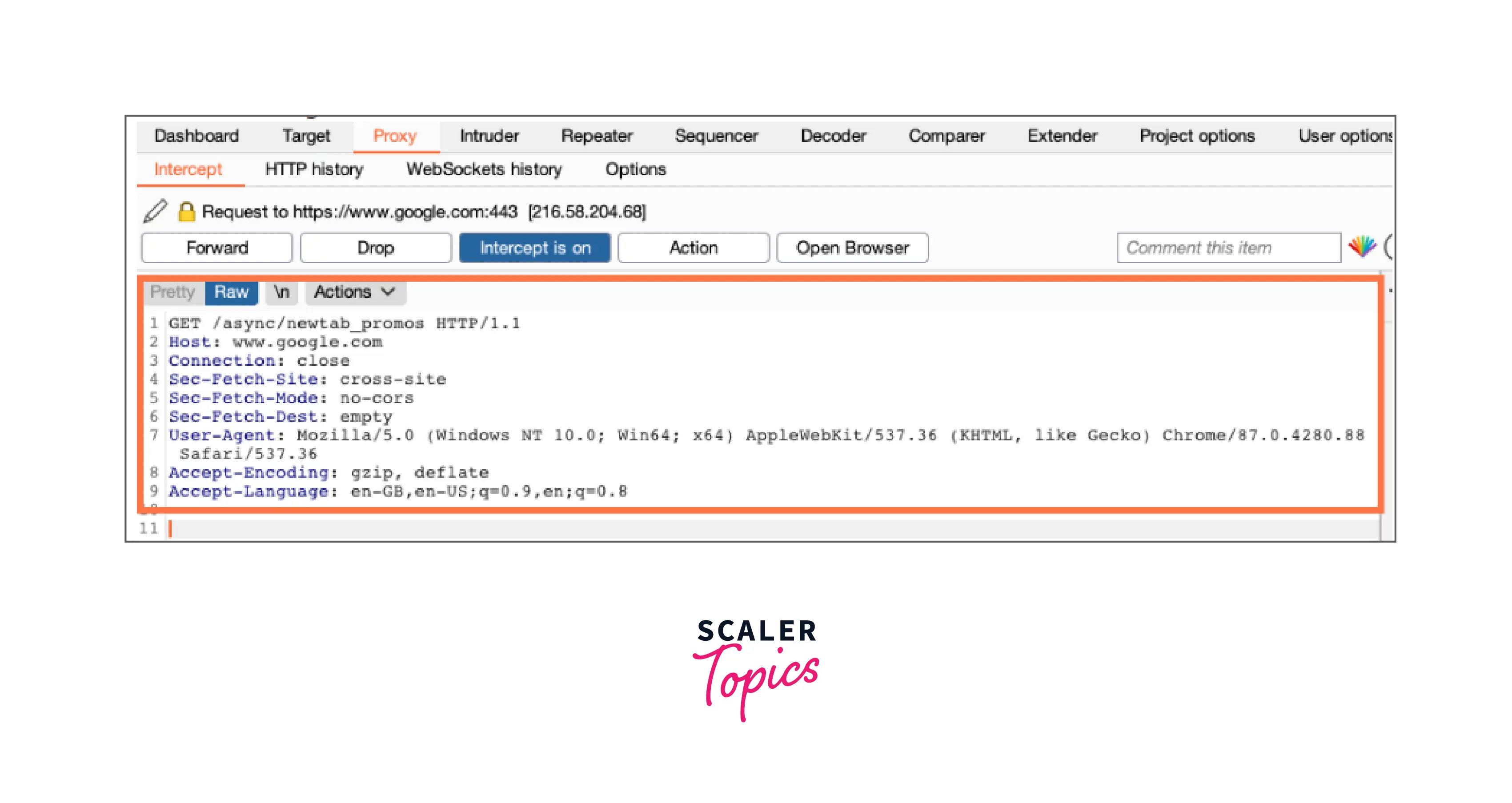 - In the proxy tab of Burp Suite, we can observe that the HTTP request was intercepted:
