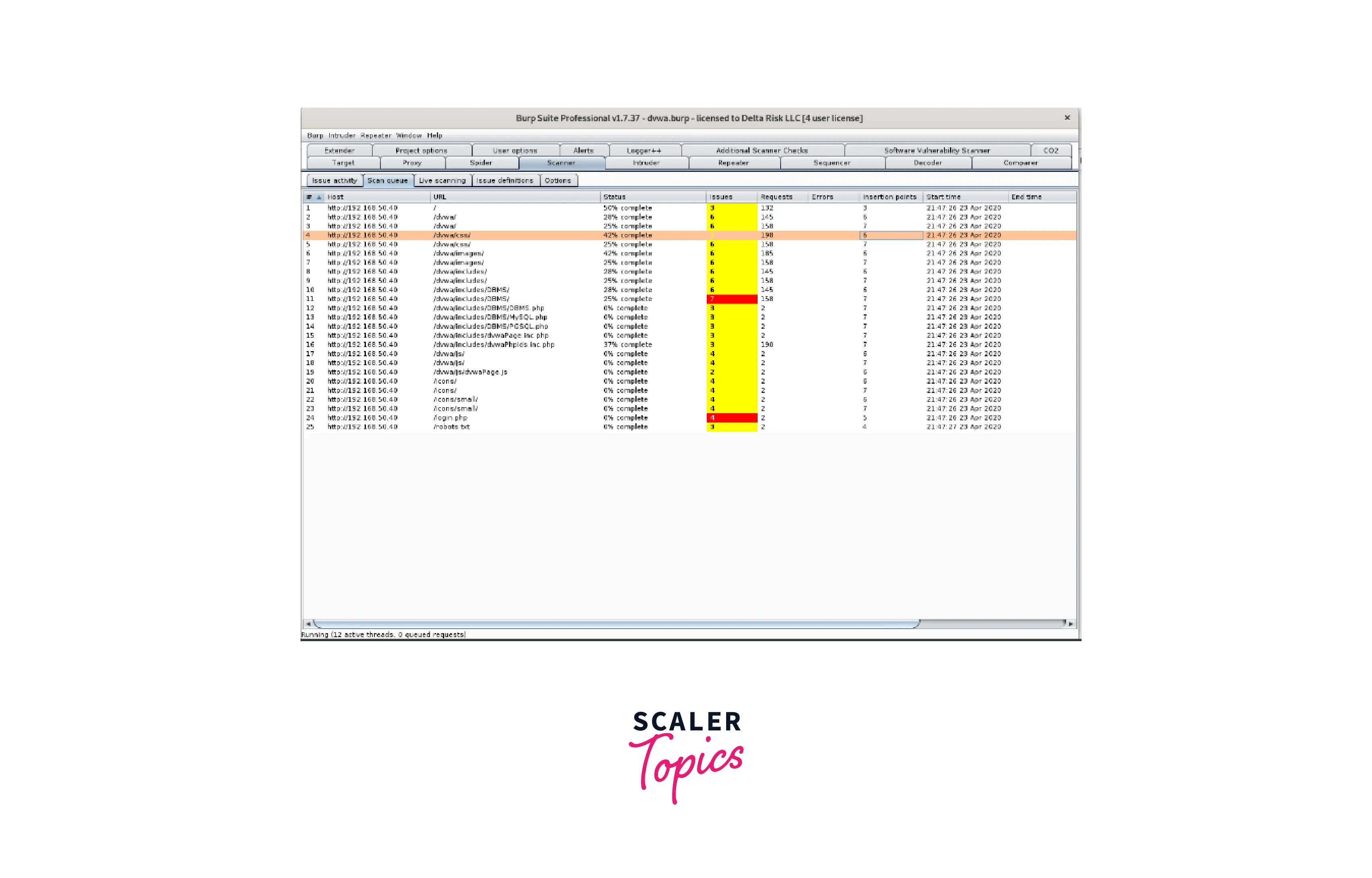 - Following the execution of the scans, you may view the status (Scanner > Scan Queue) and the most recent outcomes as displayed below. The things being scanned are broken down by "Scan Queue" into Host, URL, Status, Issues, and timestamp.