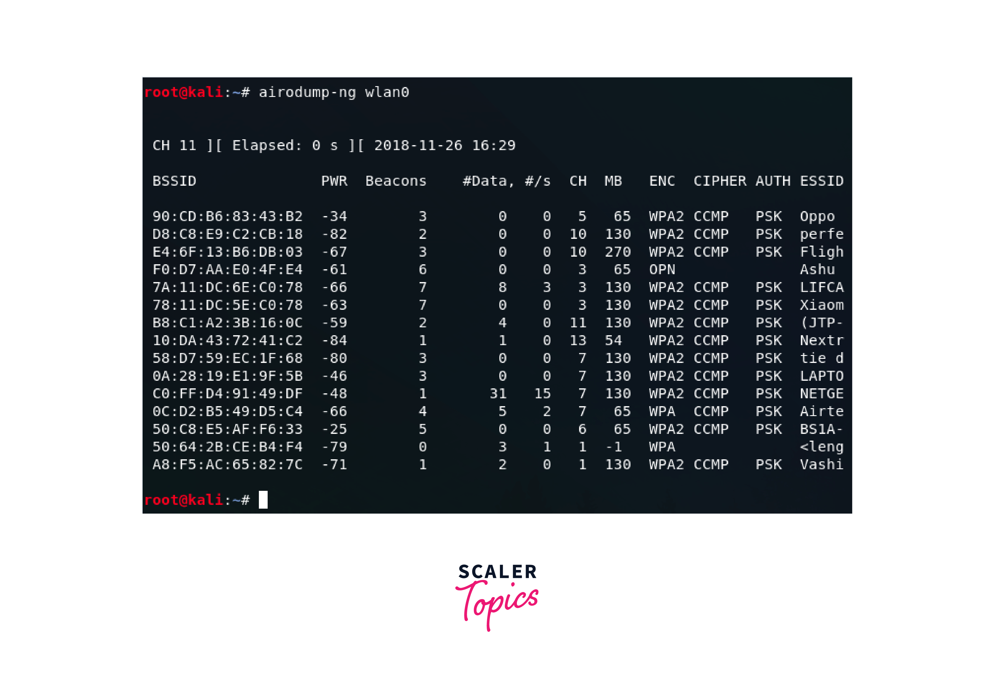 Airodump-ng will display a list of nearby Wi-Fi networks, along with essential information like BSSID (MAC address of the access point), ESSID (network name), and the number of clients connected. - Capturing Handshake:
