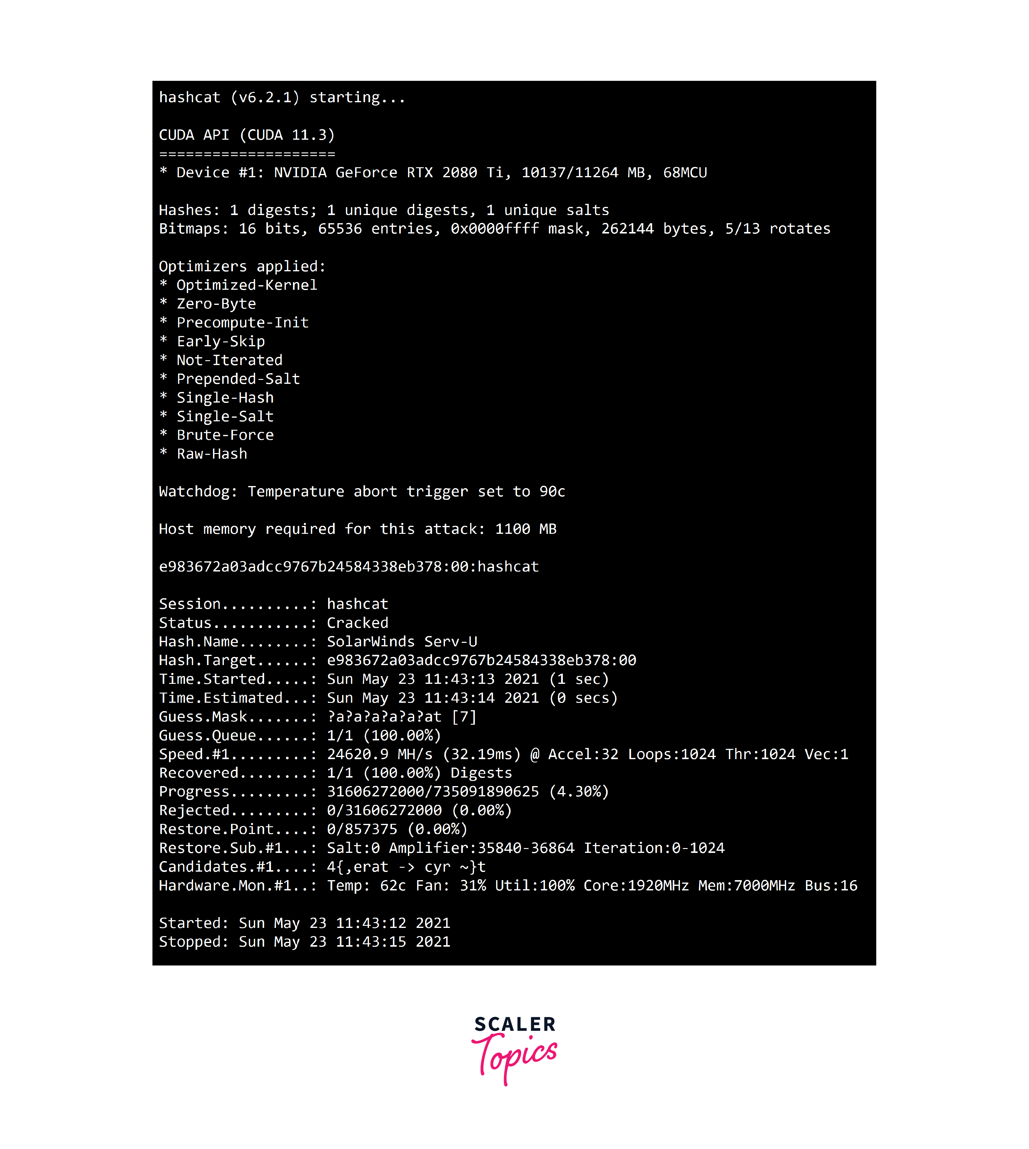 - Hashcat provides real-time feedback on its progress, including the number of password guesses per second. Monitor this information to estimate the time required for a successful crack.