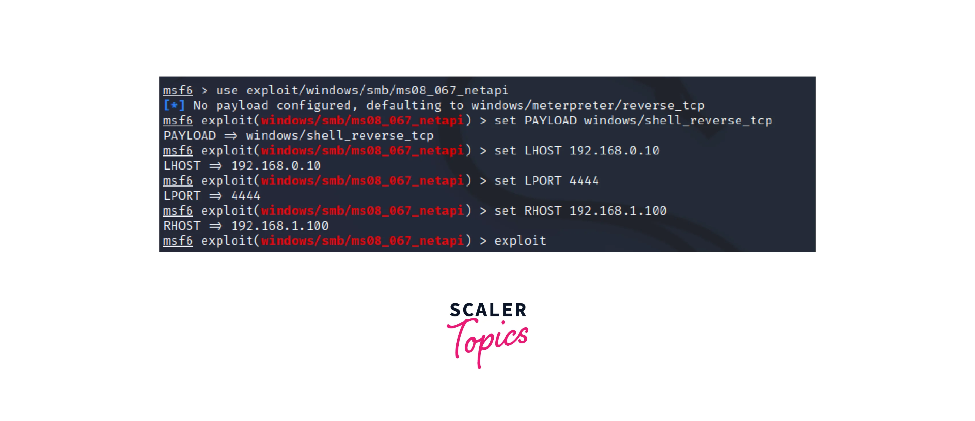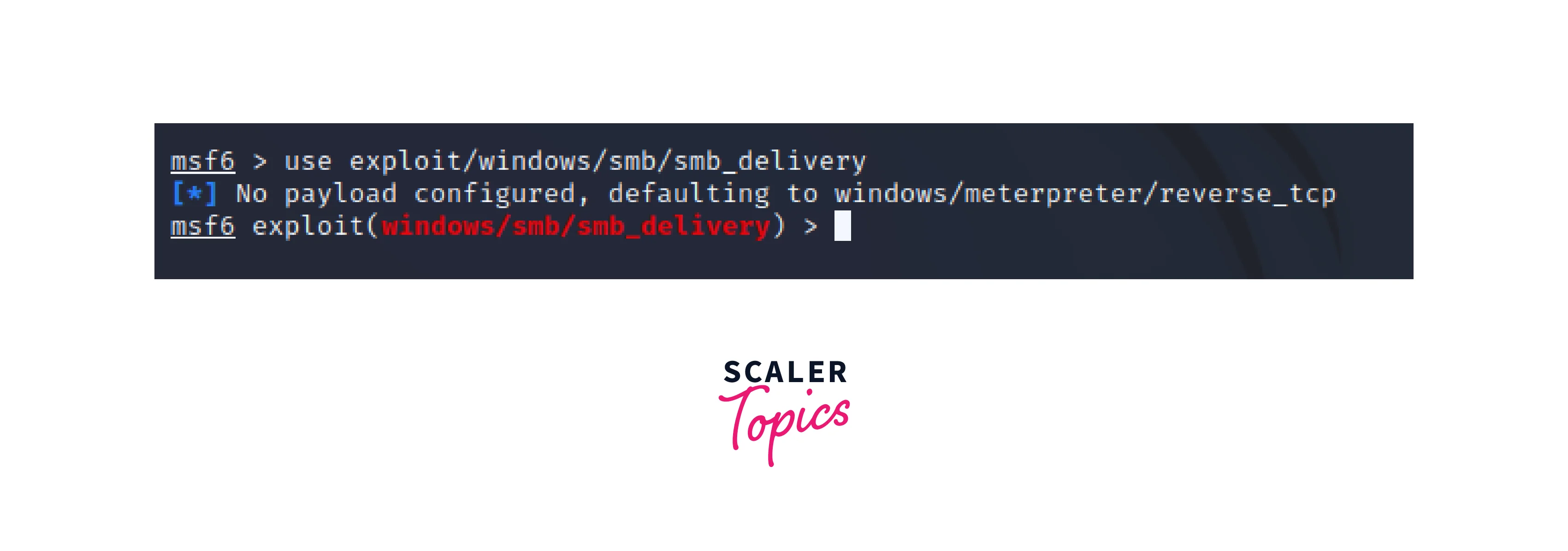 Once an exploit has been selected, the next step is to choose a payload to use. For this example, we will use the "reverse_tcp" payload, which establishes a reverse shell from the target system back to the attacker's machine. -