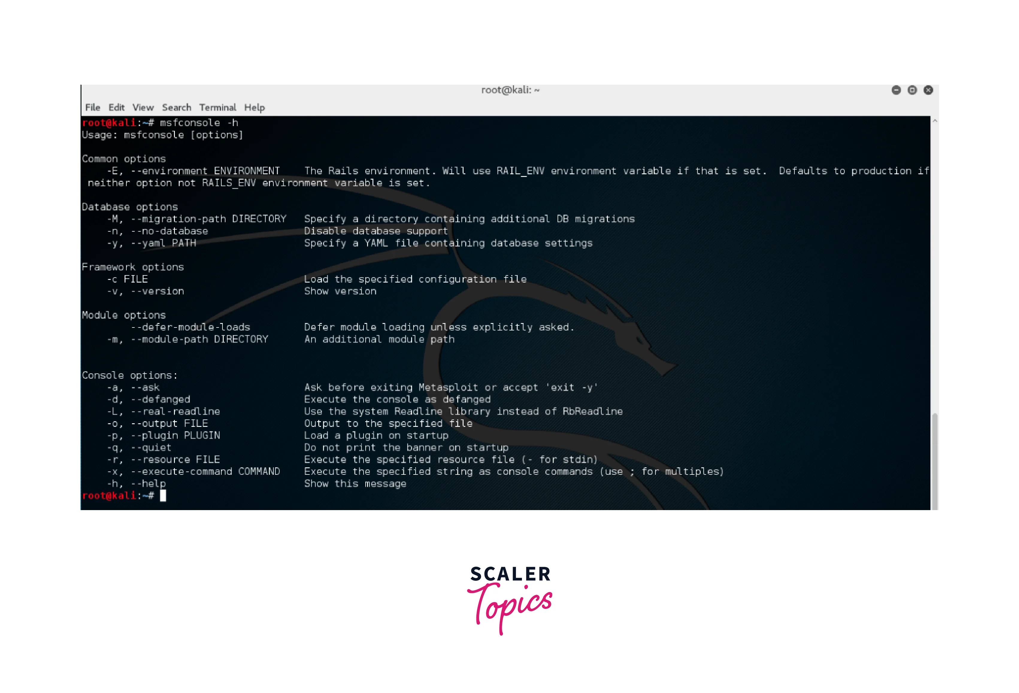 The help command is used in msfconsole to show the list of commands and their descriptions when used without any argument. When passed another argument is in the format of “help another_command” which then returns the help content of that command.