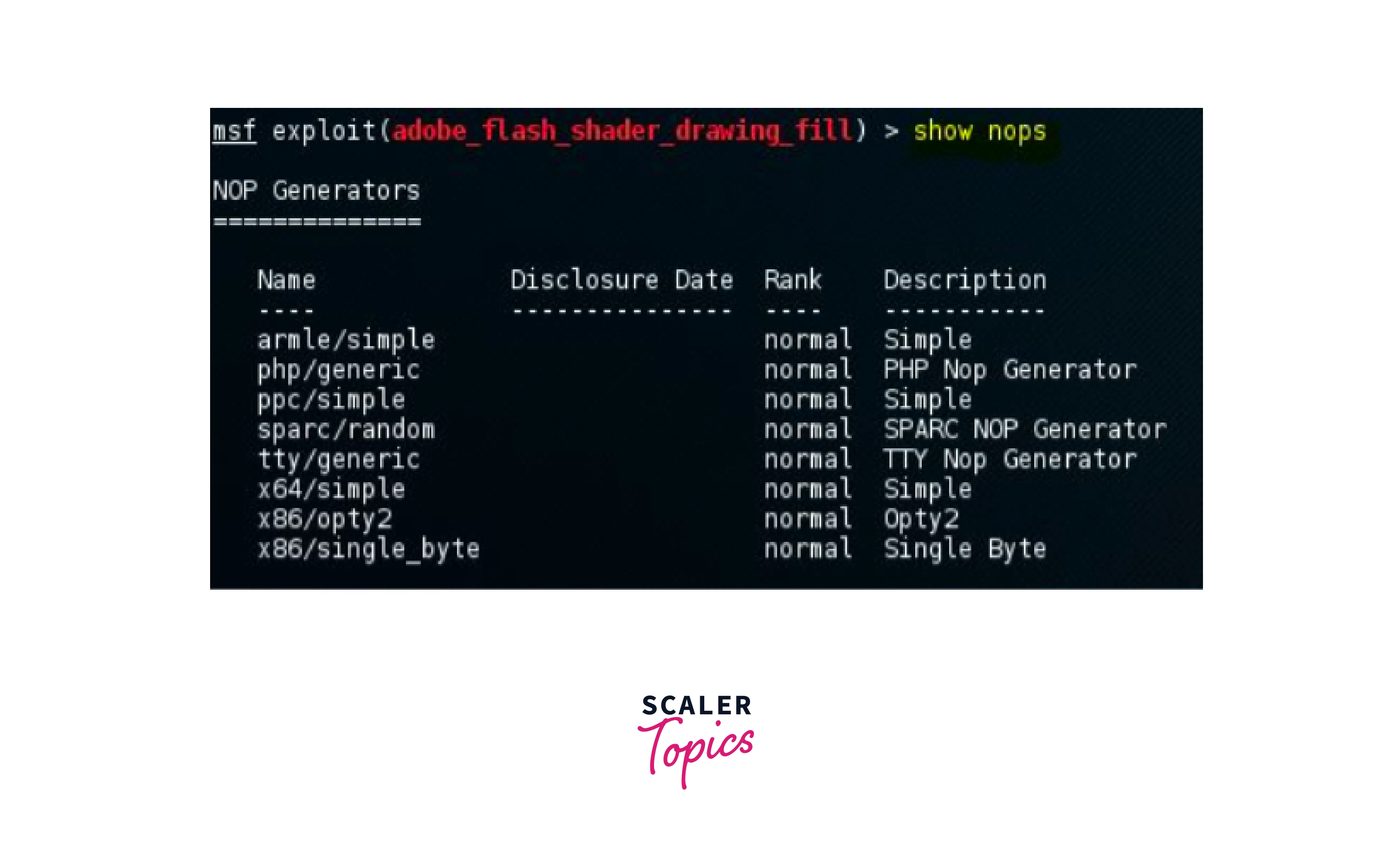 This command is used to keep the payload size consistent. NOP is a short form for No Operation. This includes the name, disclosure date, rank, and description of the NOP generator and the name includes the architecture of the CPU and the type of encoding used in it. This example shows the NOP generator options of the smb_delivery module. Similar to encoders these NOP generators are also used to evade intrusion detection and prevention systems. This example shows the NOPS options of the smb_delivery module.
