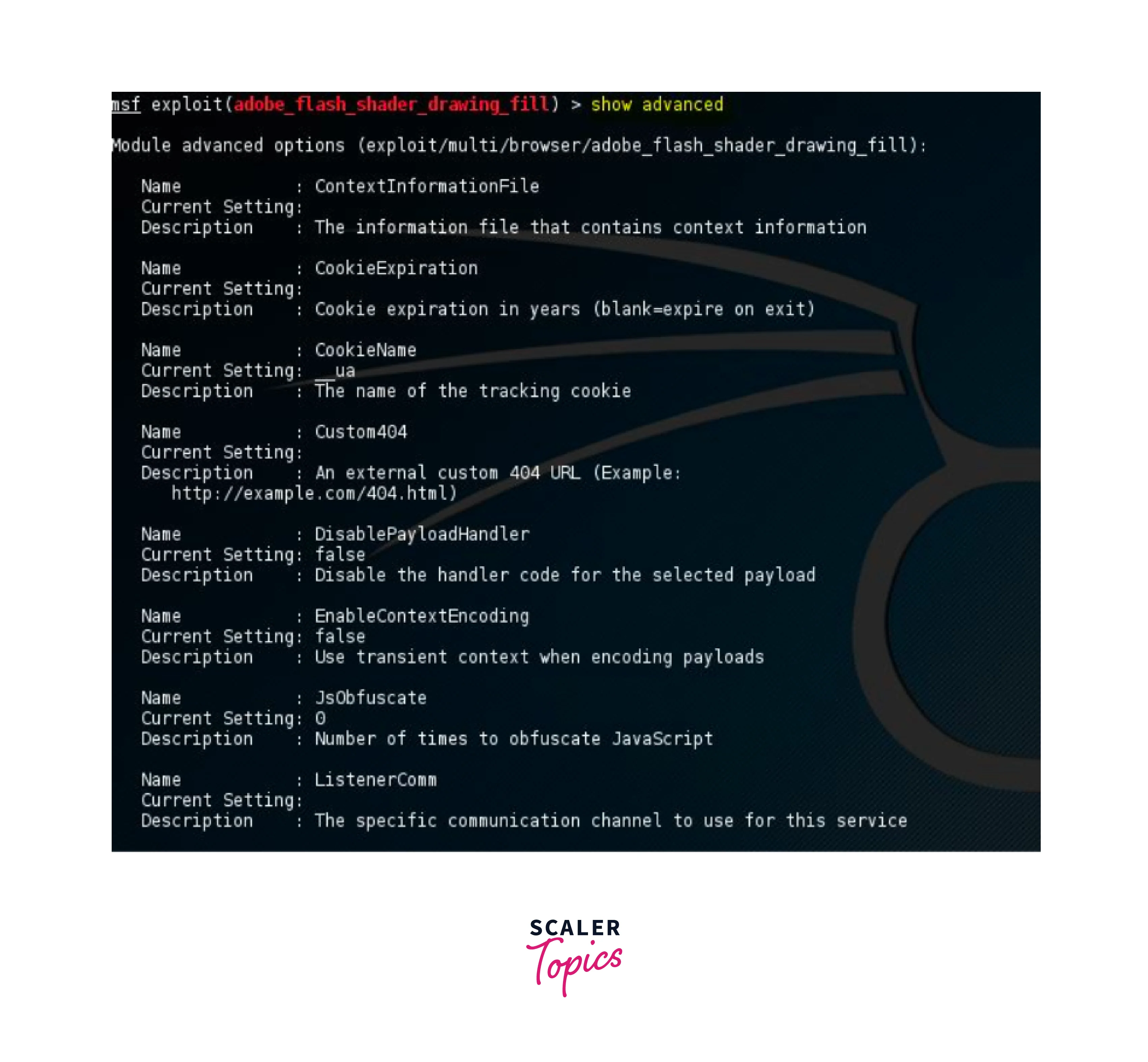 In this article, we will also be covering some of the commands which help the user to use the software as required, some of these commands include show options, show payloads, show targets, show advanced, show encoders, show nops, and show evasion.