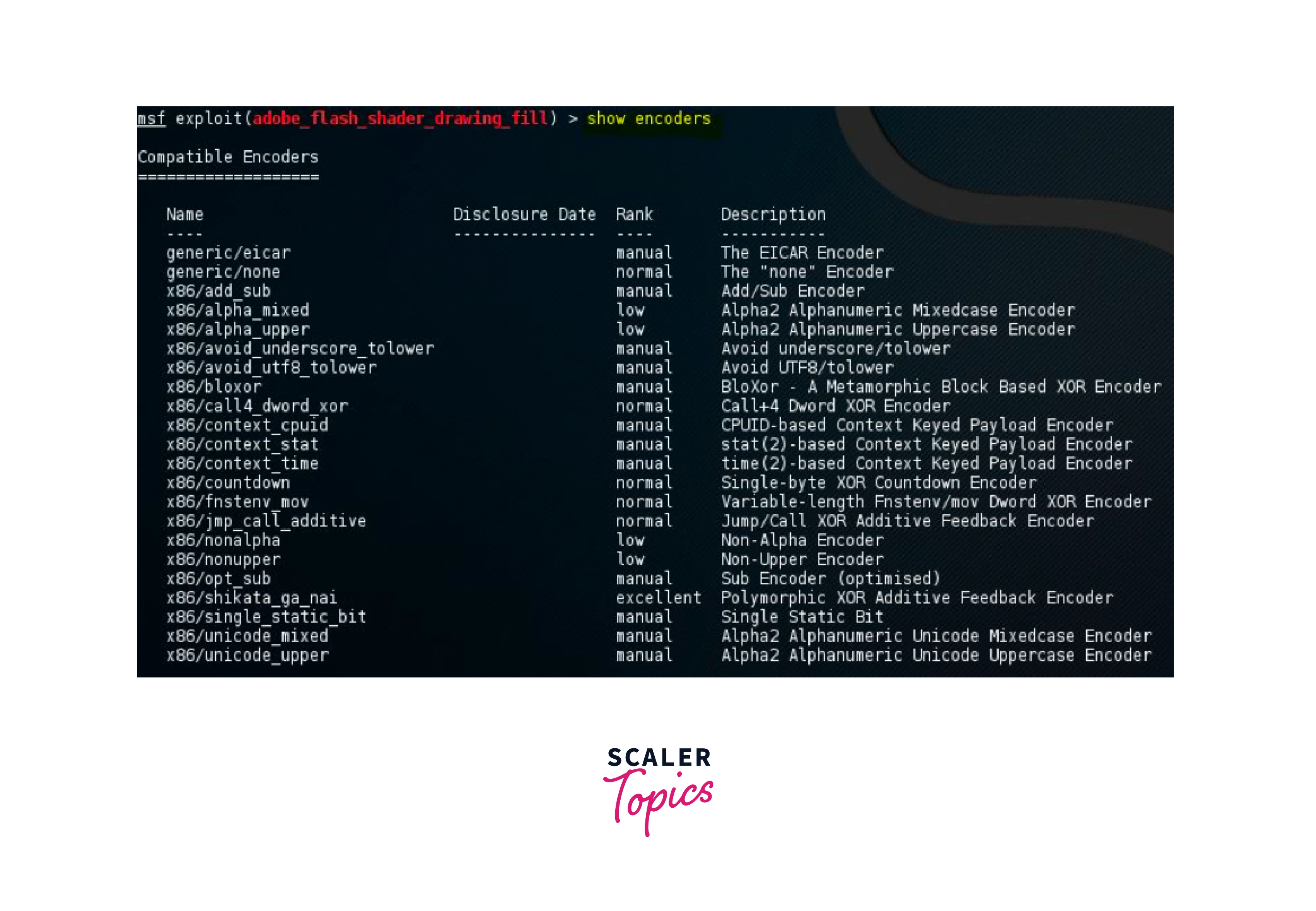 This command is used to show the list of all the available compatible encoders. This includes the name, disclosure date, rank, and description of the encoder. These encoders are used to encode the payload so that the intrusion detection and prevention systems can be tricked. This example shows the encoder options of the smb_delivery module.