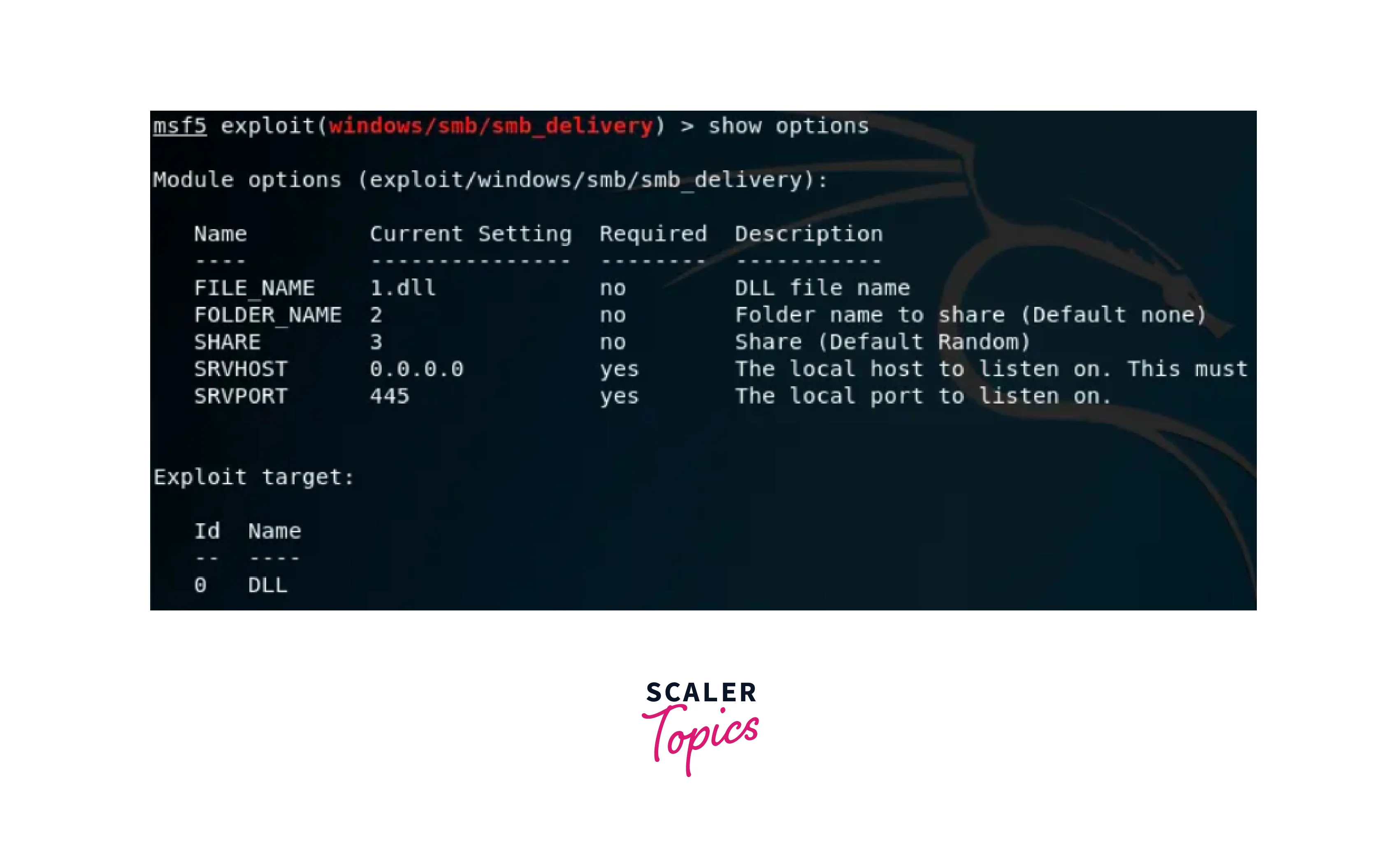This command shows the module options, payload options, and exploit targets of the mentioned exploit. We can observe the same in the following image of the smb_delivery exploit. You may use any of the following module options or the payload options.