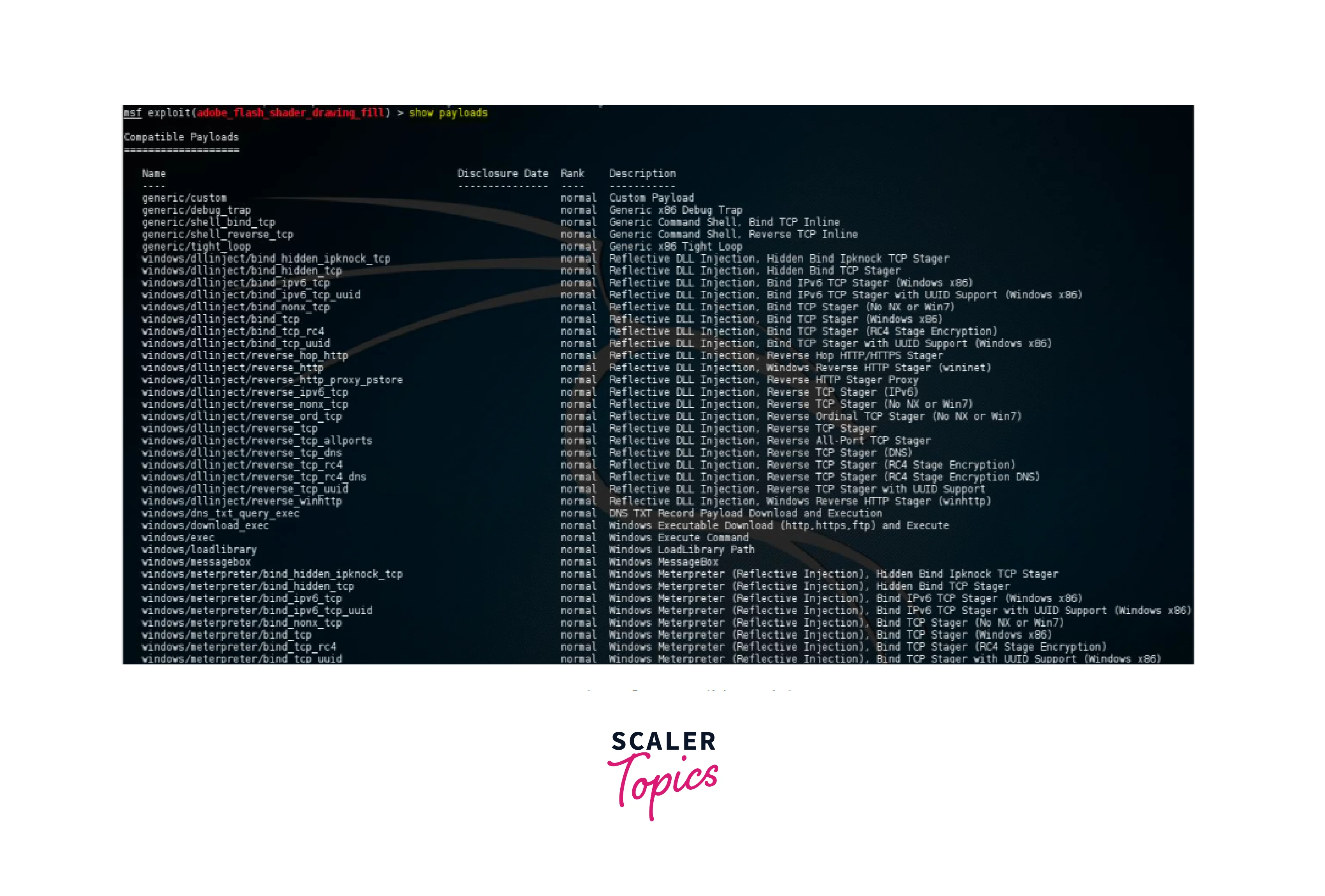 This command is used to show the list of all the payloads of the following exploit. This includes the name, disclosure date, rank, and description of the payload. In the example of the smb_delivery exploit the following payloads are available: