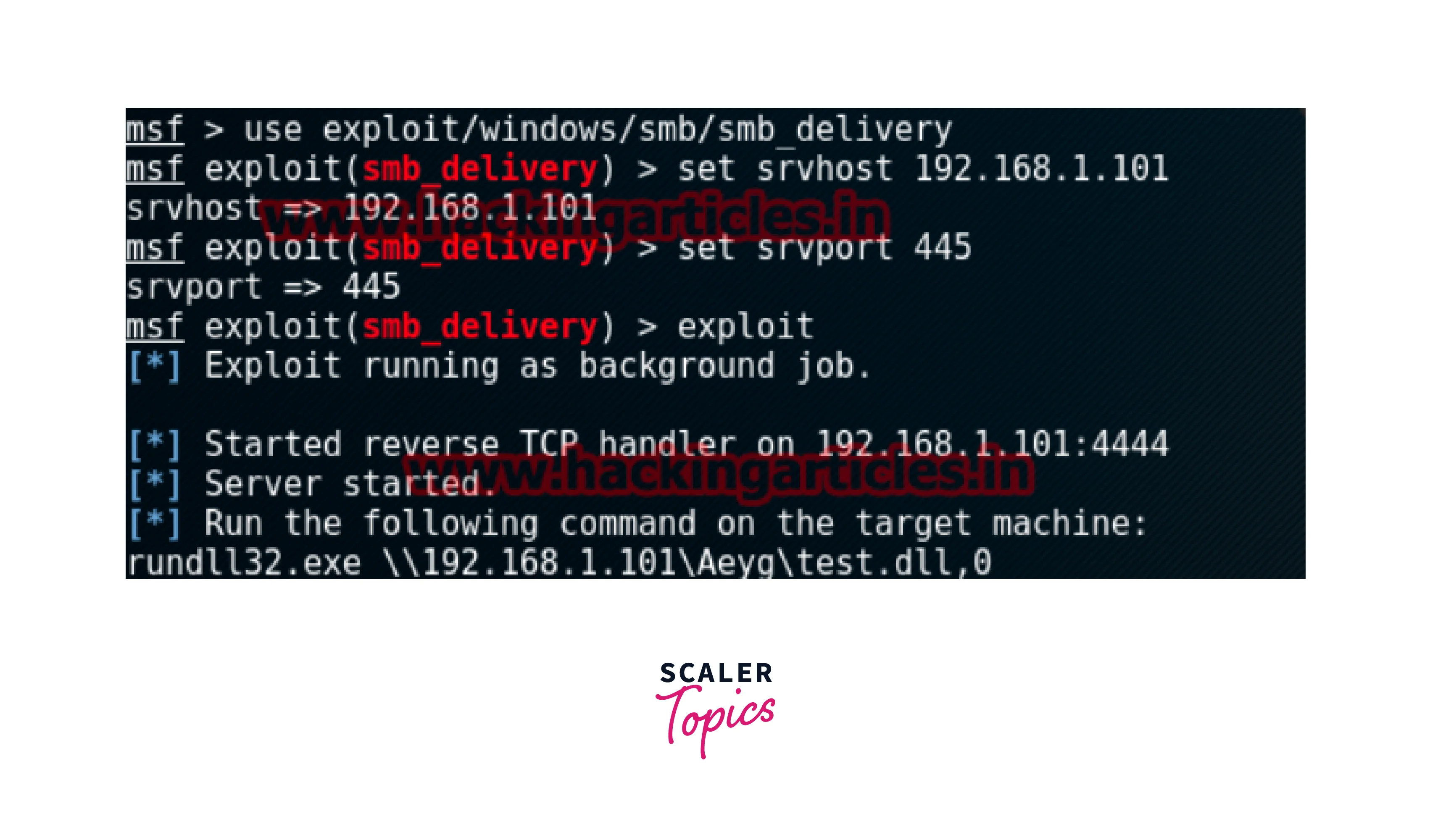 - The Metasploit command for execution of the exploit is “run” or “exploit”.