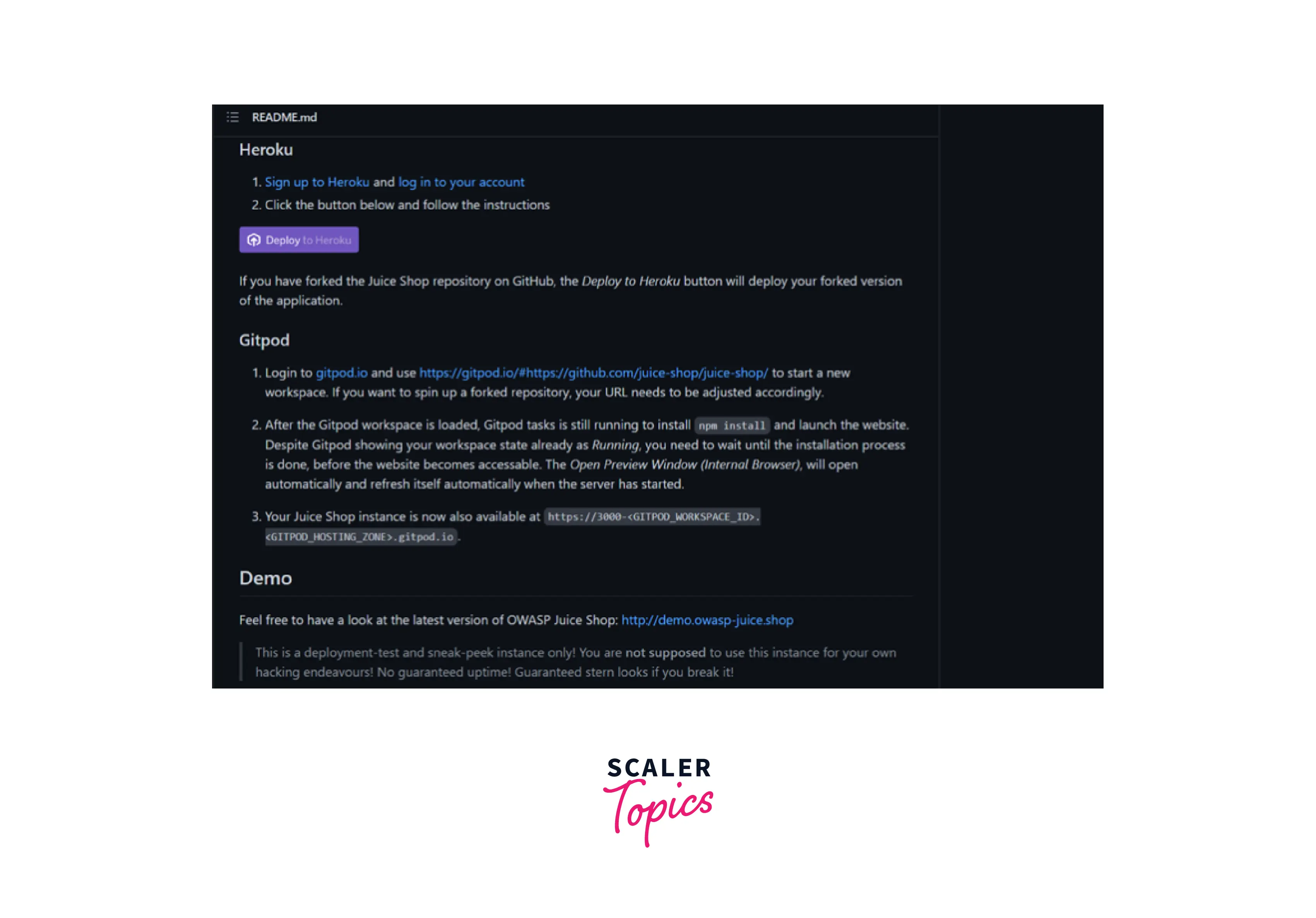The fastest way to use the instance of this vulnerable web app is by clicking the "Deploy to Heroku" button that comes within the README.md file. You have to log in to the Heroku account, & it will redirect you to a single instance that hosts the application. In case you fork the repository on GitHub and then click the "Deploy to Heroku" button, it will deploy the forked version (customizable) version of OWASP Juice Shop.