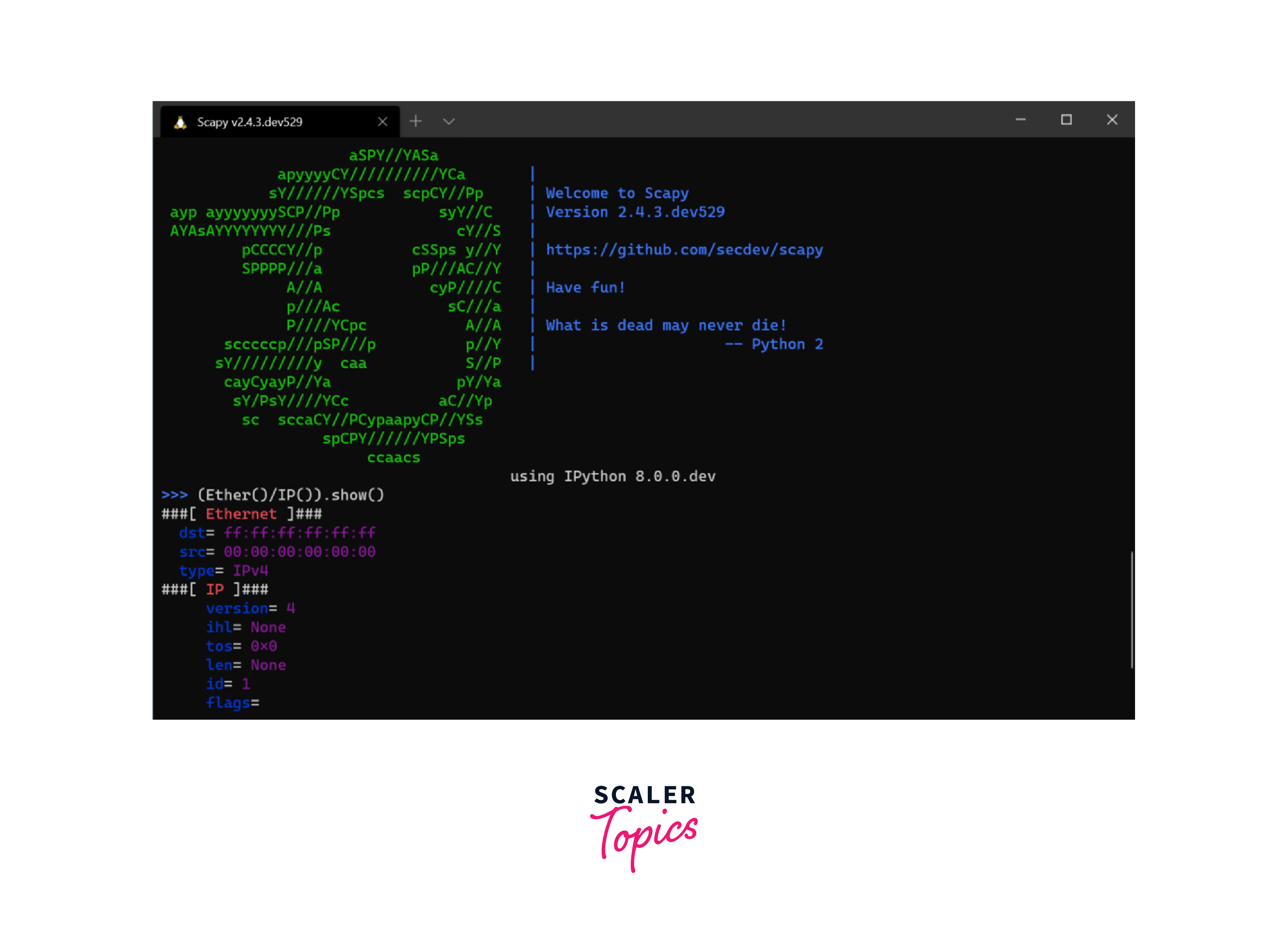 - Install Scapy using pip install scapy to get started.