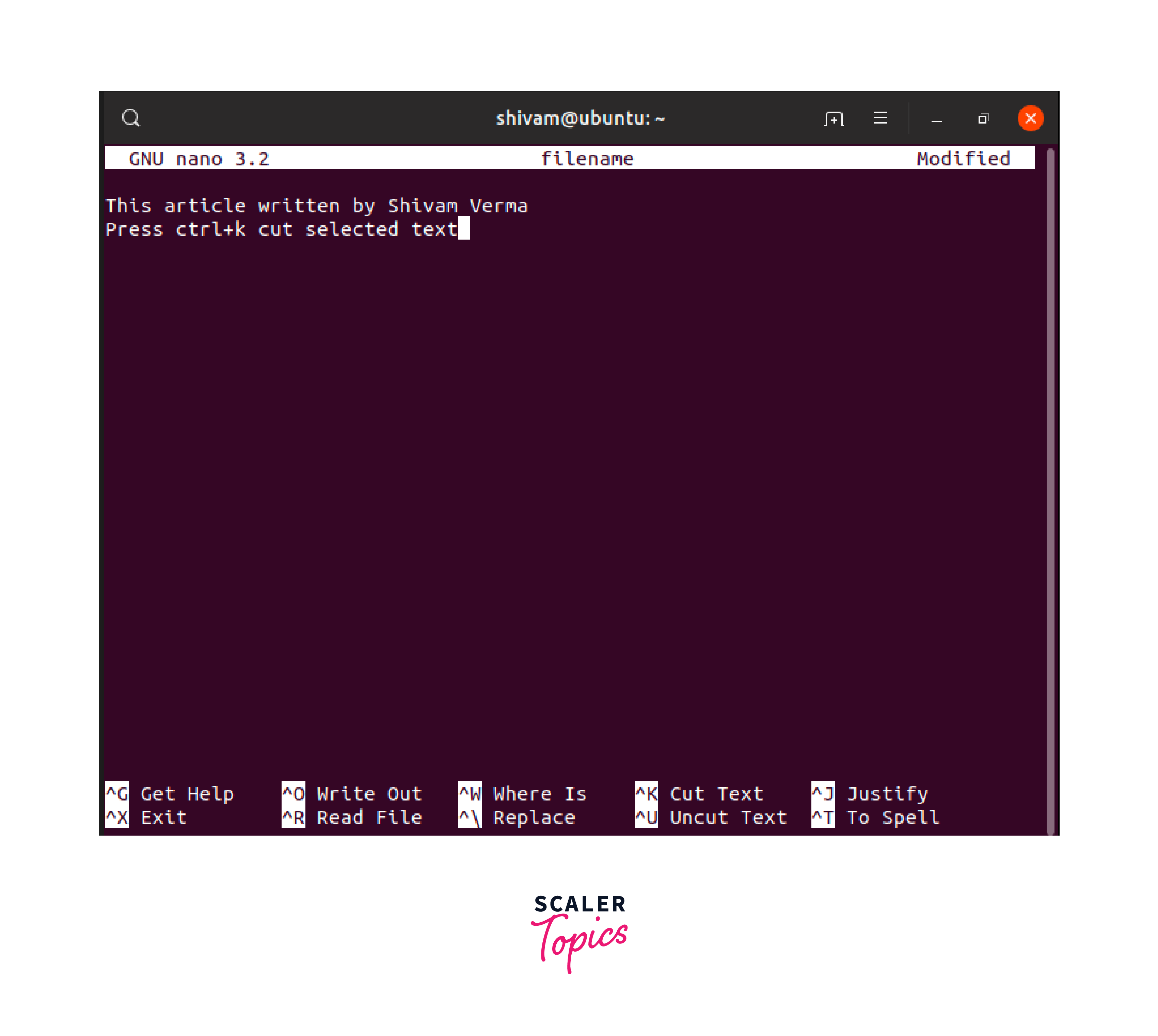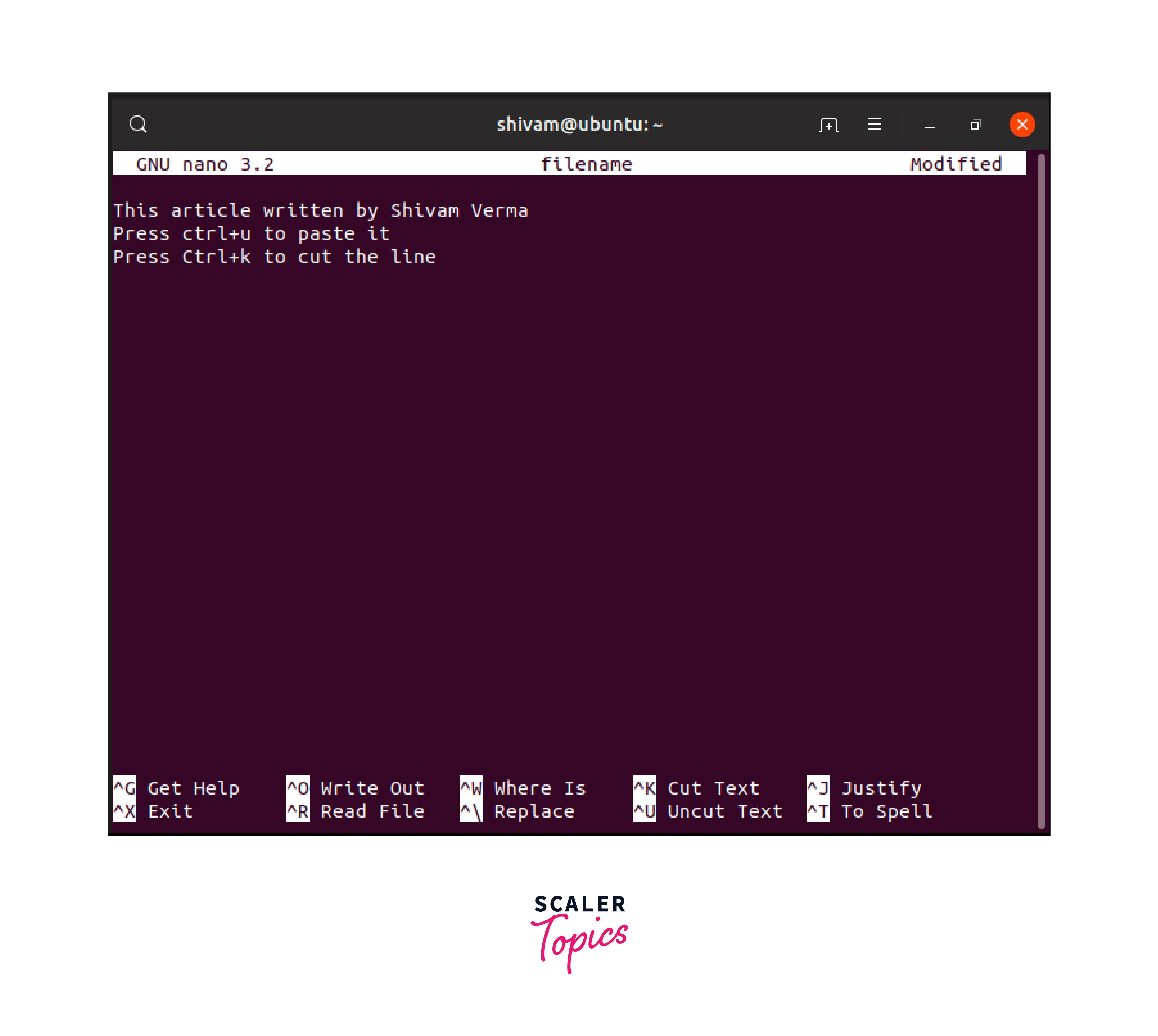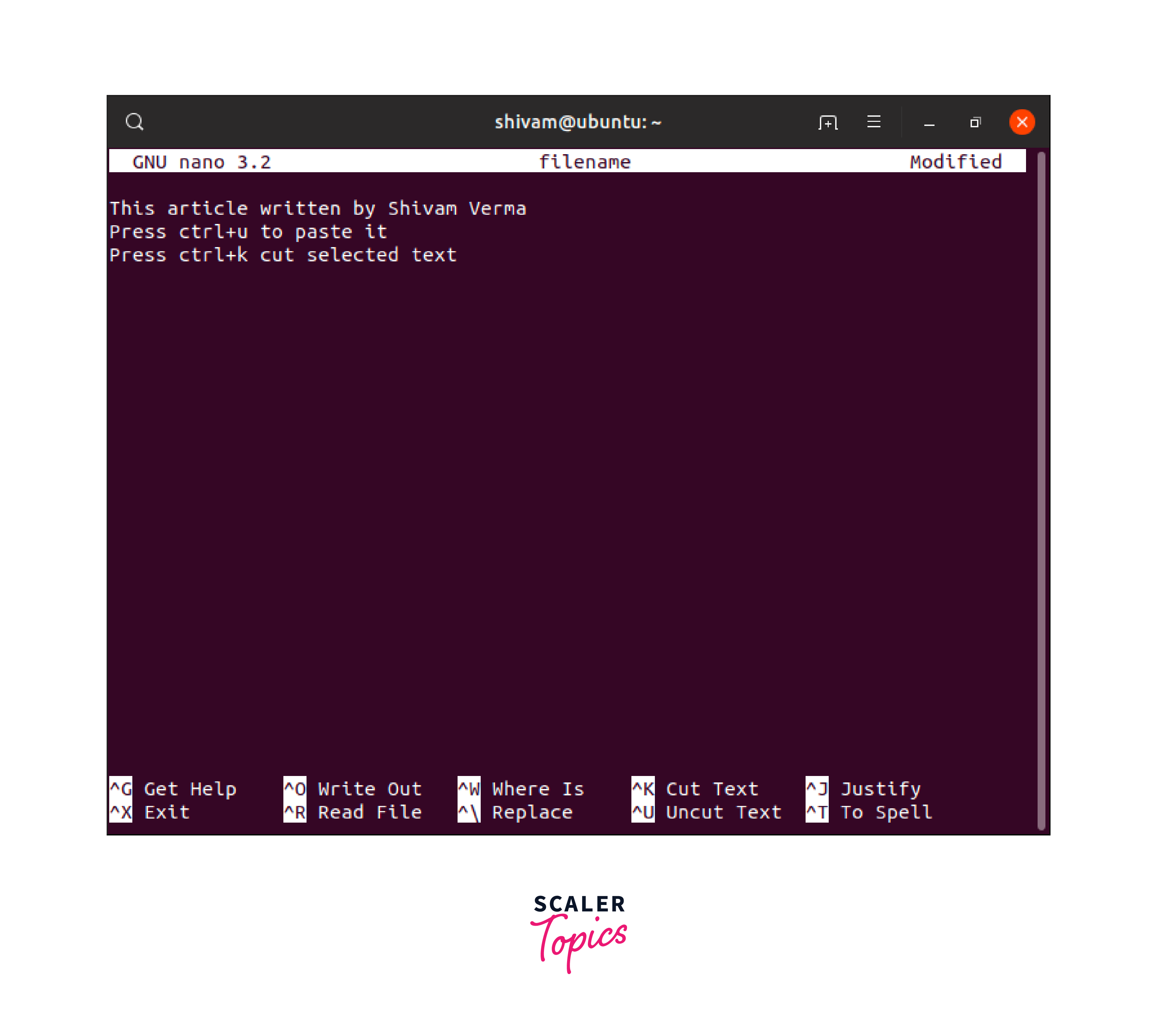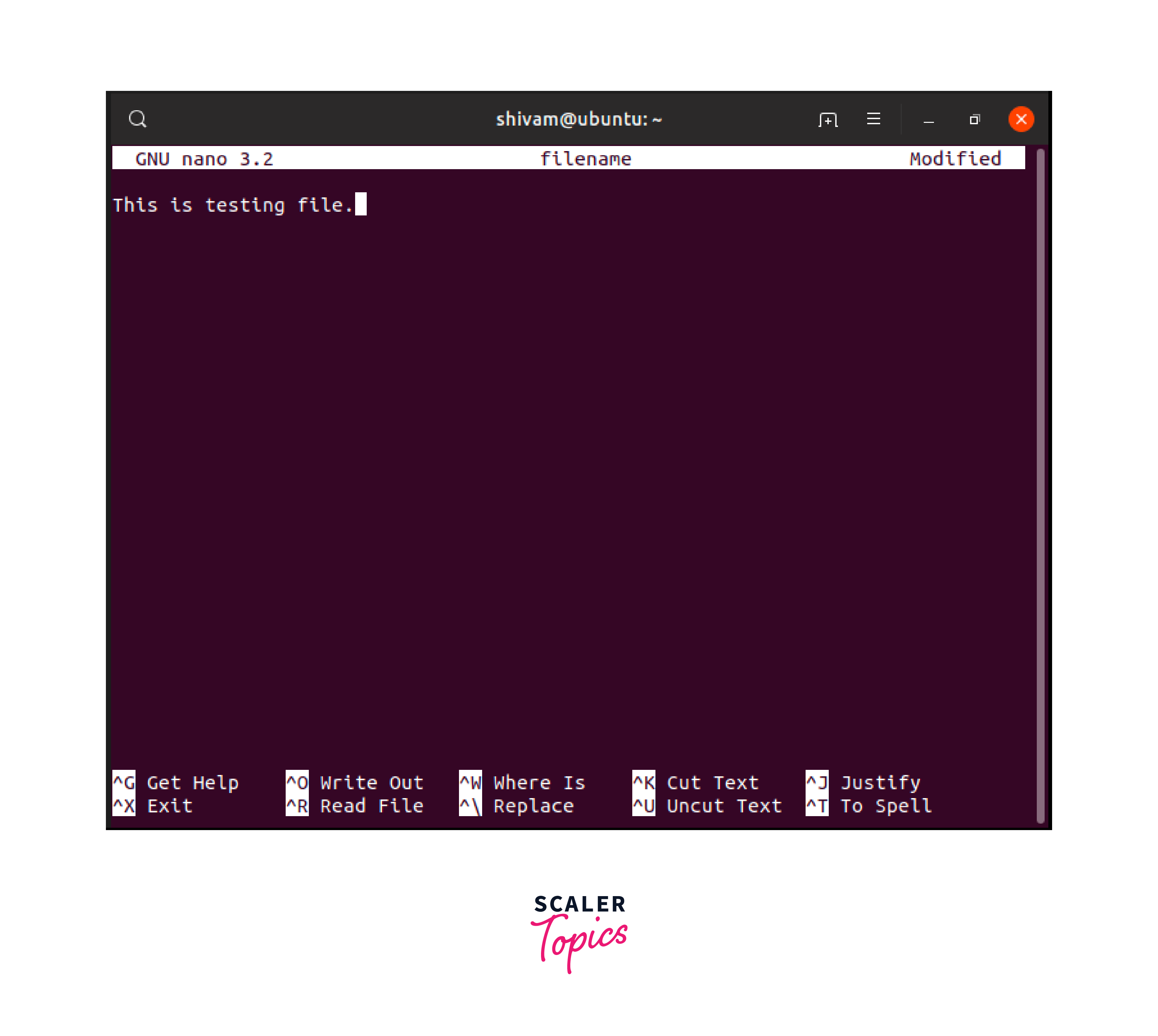 The above command will create a new file with the name shown in the output. If the file already exists, it will be opened; if it does not exist in the current directory, it will be created. Additionally, at the bottom of the Nano window, you'll find a list of shortcut keys for your reference. All commands in Nano are indicated with either the caret symbol (^) for the Ctrl key or the letter M for the Alt key. For example, when you see ^J, it means you should simultaneously press the Ctrl and J keys. To access a complete list of commands, simply type Ctrl+G.