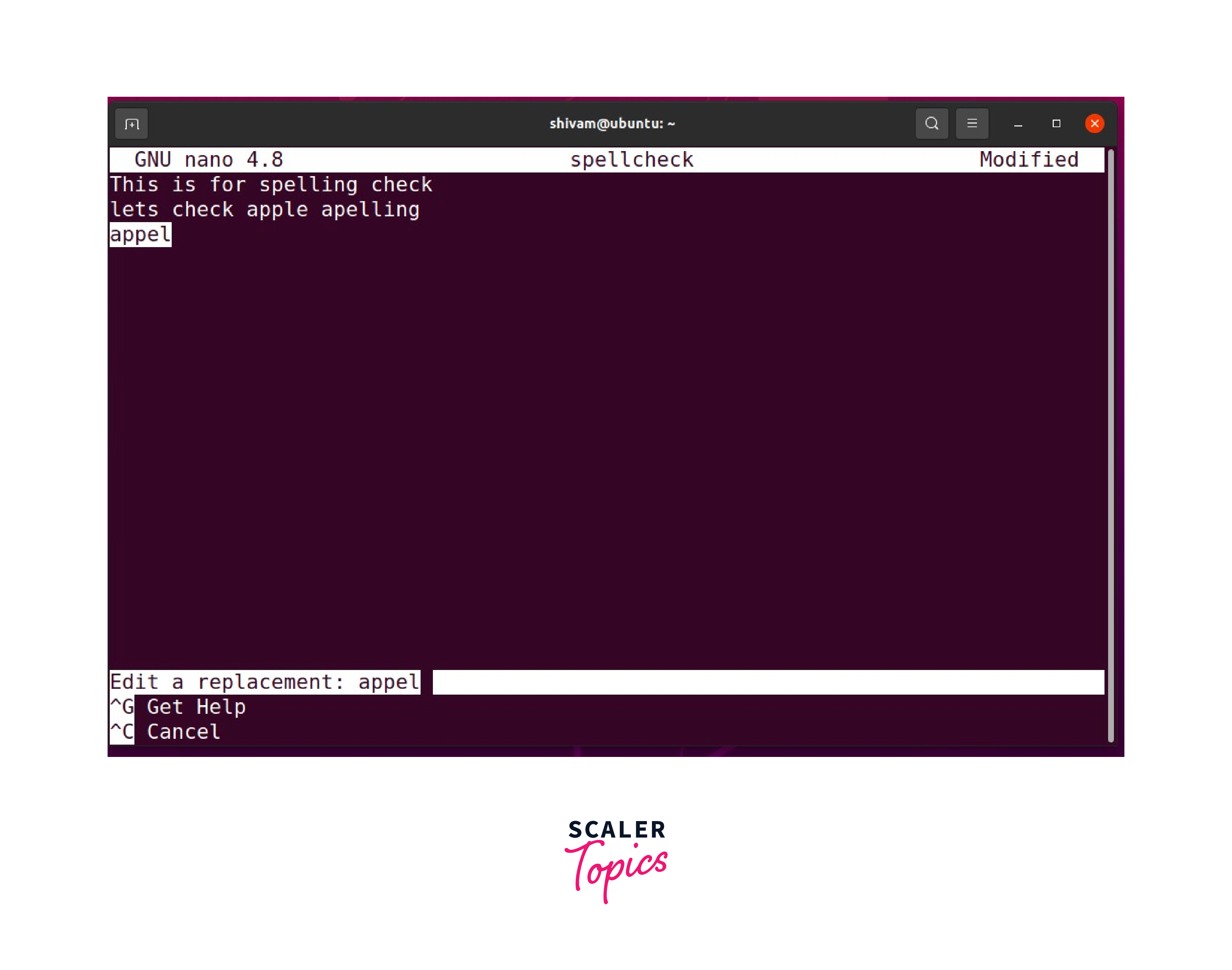 To perform a spell check, first press Ctrl+t. It will ask you to enter the correct word to replace the incorrect one. After you enter the replacement word, simply press the Enter key.