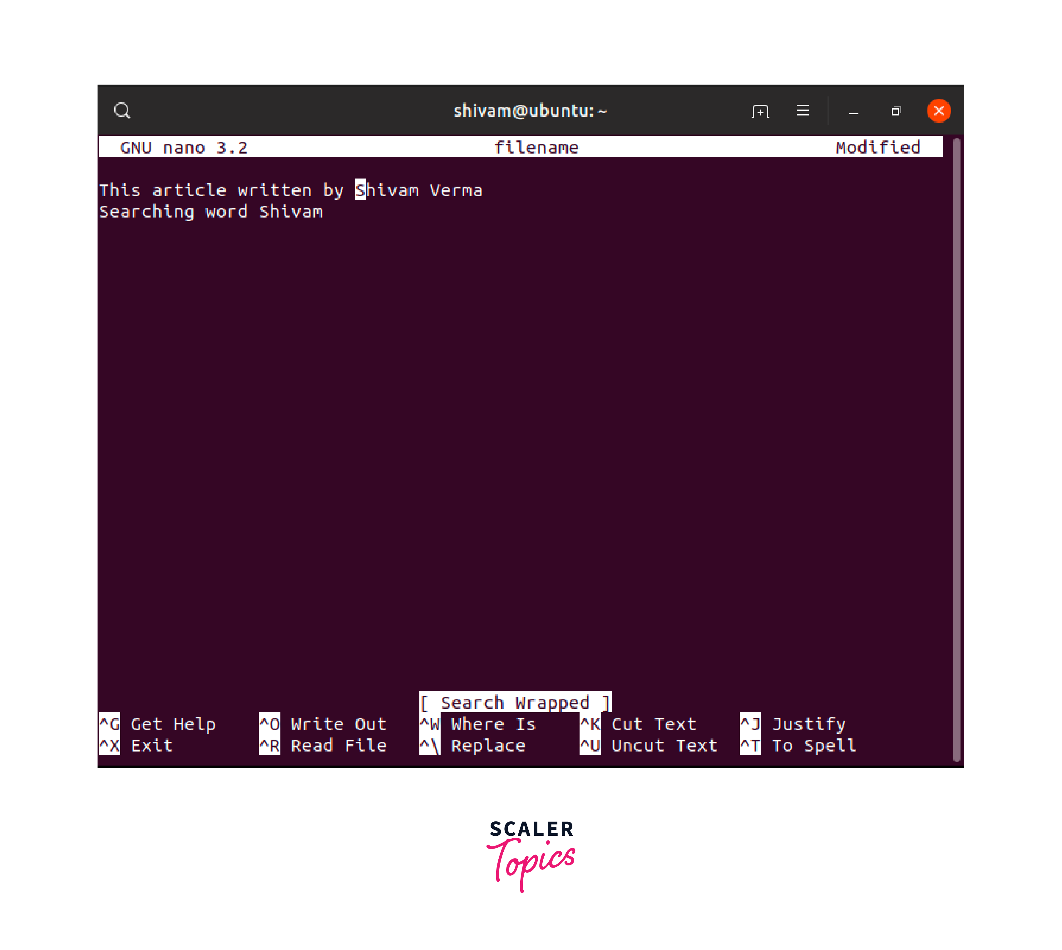- To search for a particular word in a file using Nano, press Ctrl+W. This command prompts you to enter the word you want to locate. After entering the word, Nano will search for it in the file and position the cursor at the start of the first occurrence of that word.