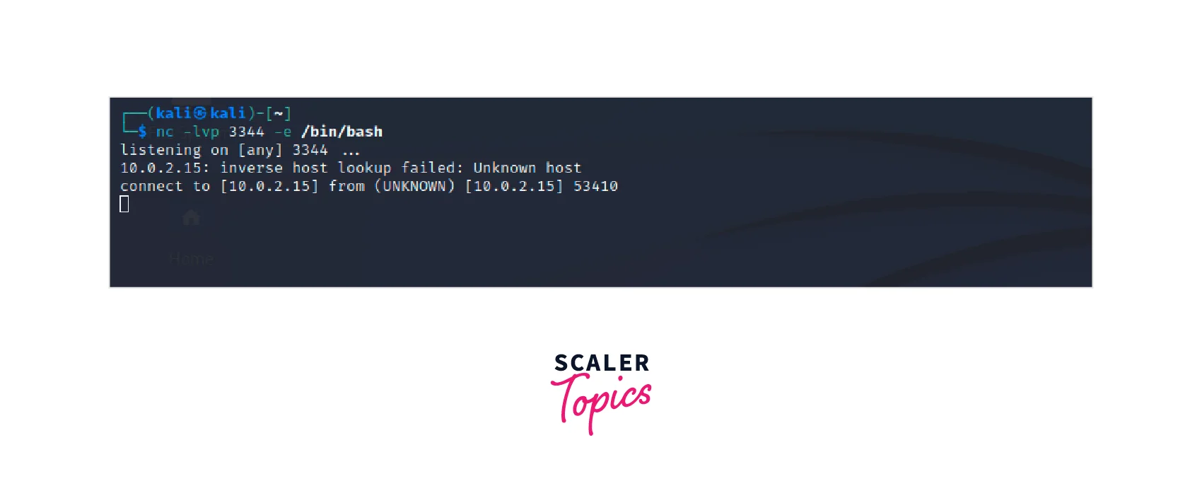In this image, we can observe that we have set up the target system to listen on port 3344 and initiate a bash shell for the execution of commands once connected.
