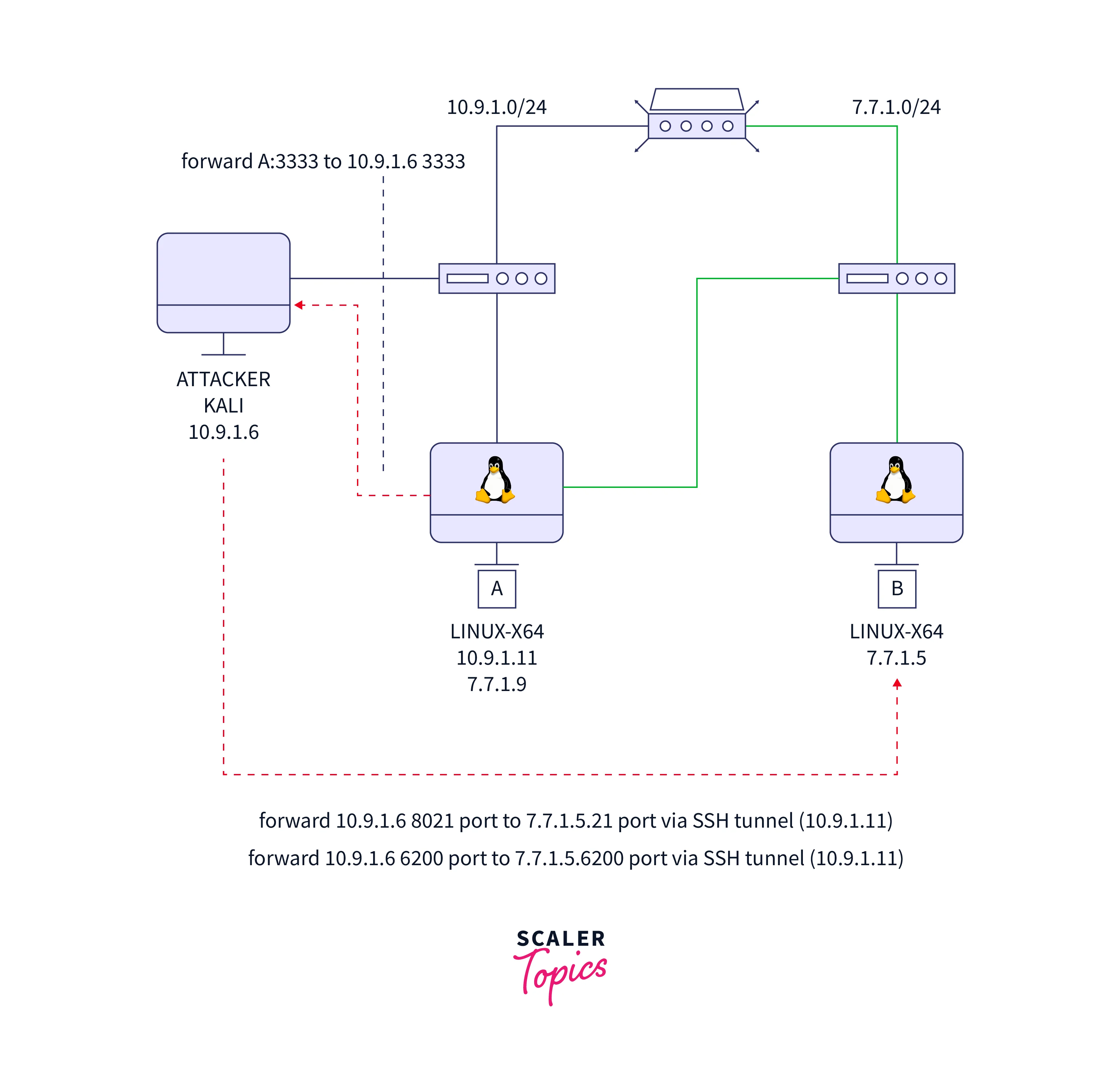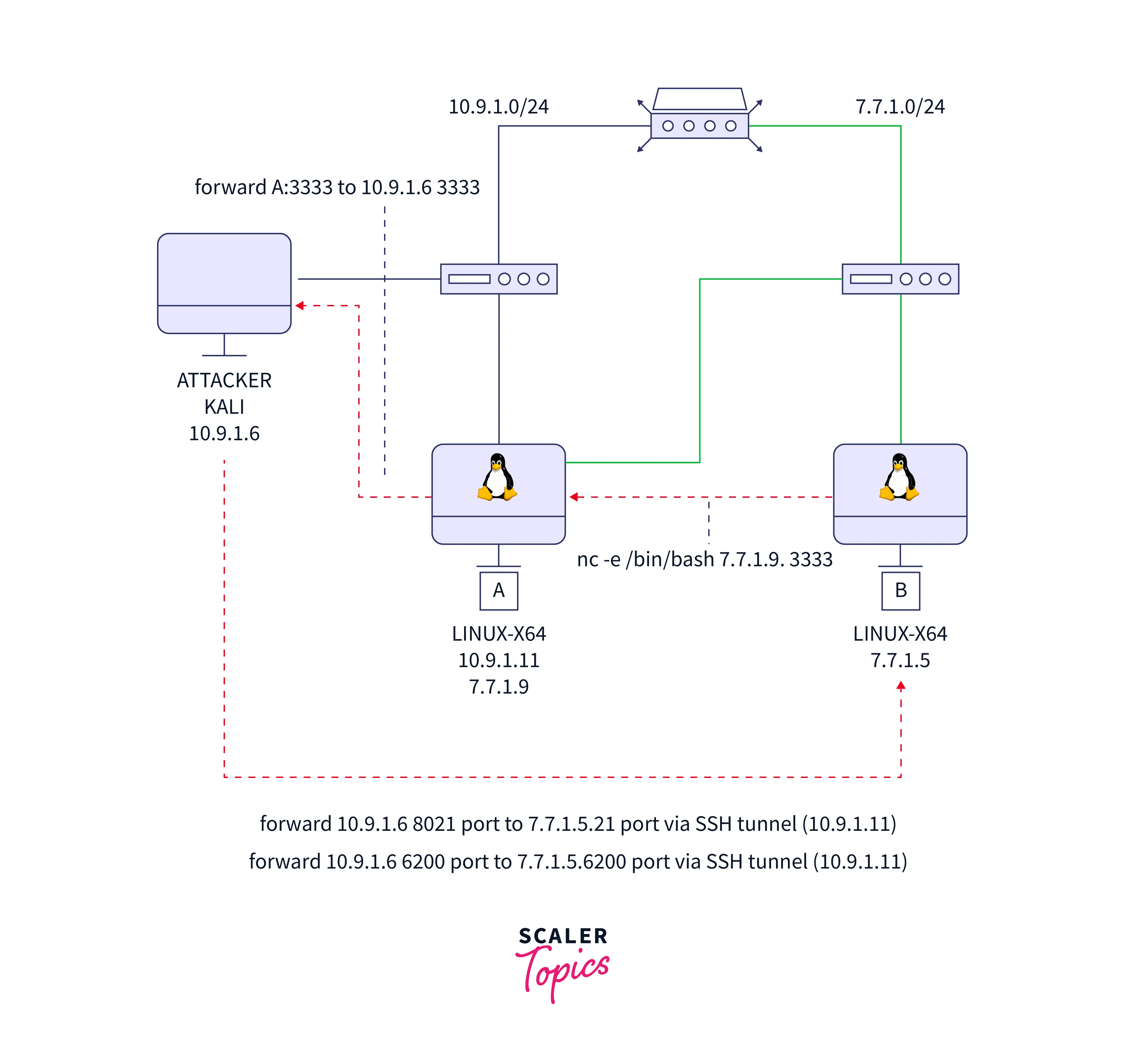 - For a back connection from machine B to the attacker, reverse port forward through nc on machine A is used.
