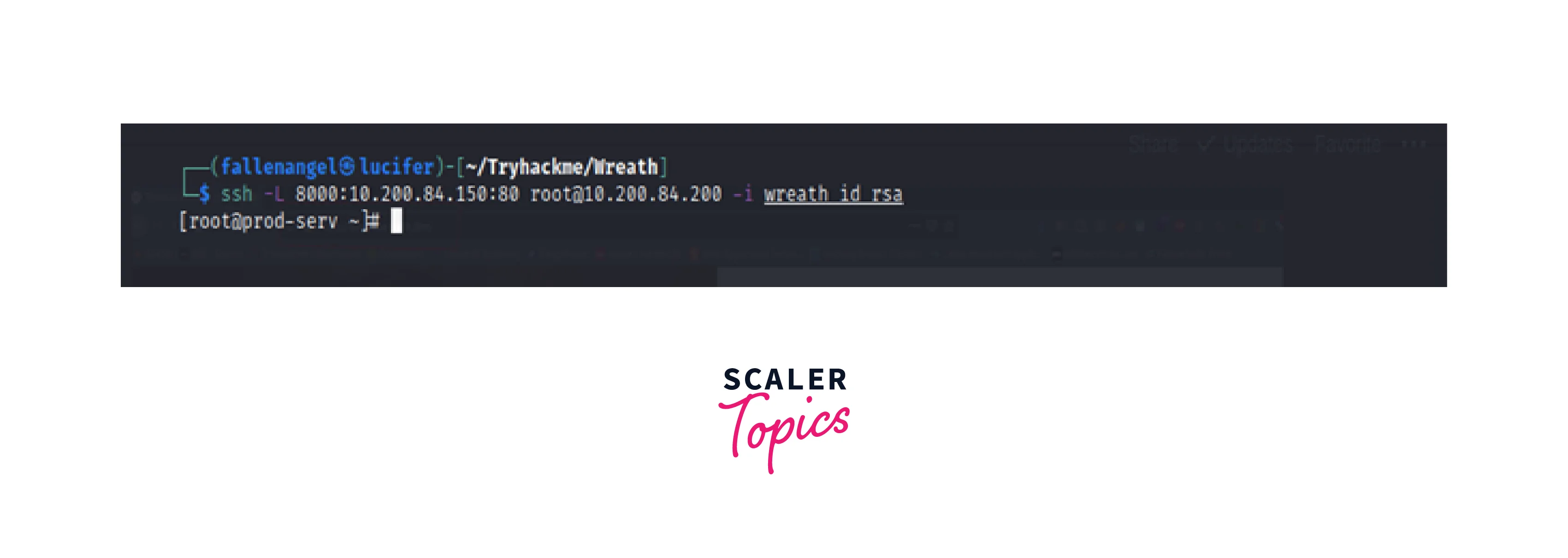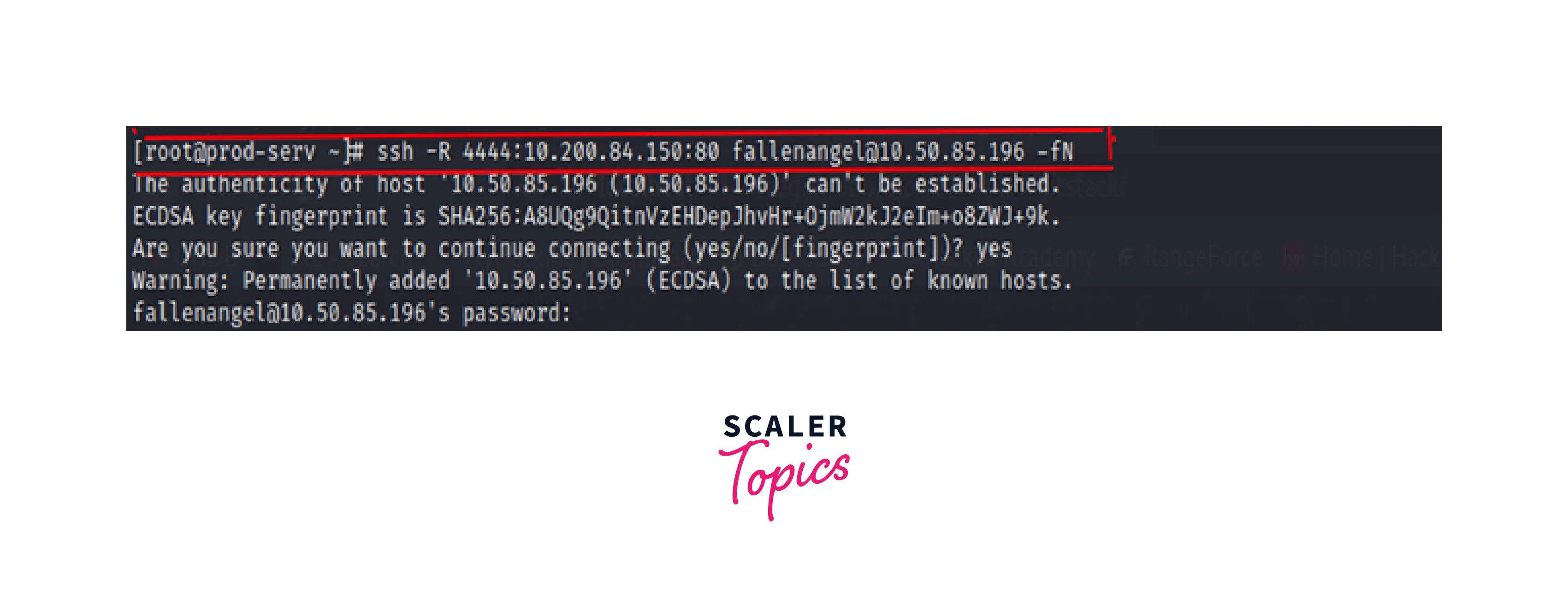 -R: We are establishing an SSH connection with the attacker system and binding remote port [4444] to service [80] running remotely at 10.200.84.150.