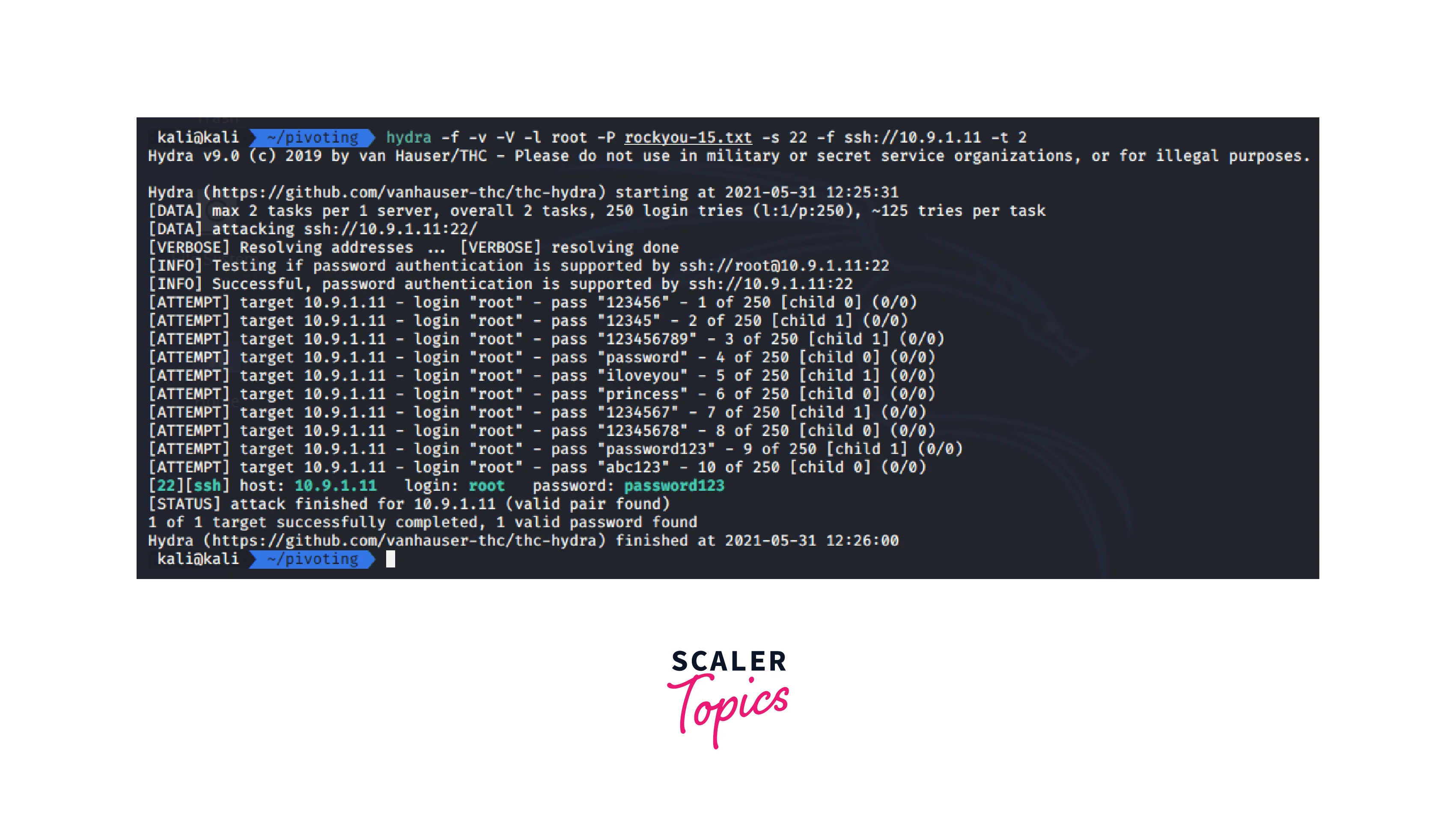 - By using brute force SSH through Hydra, the attacker gained access to machine A (10.9.1.11), which was on the same network as the attacker.