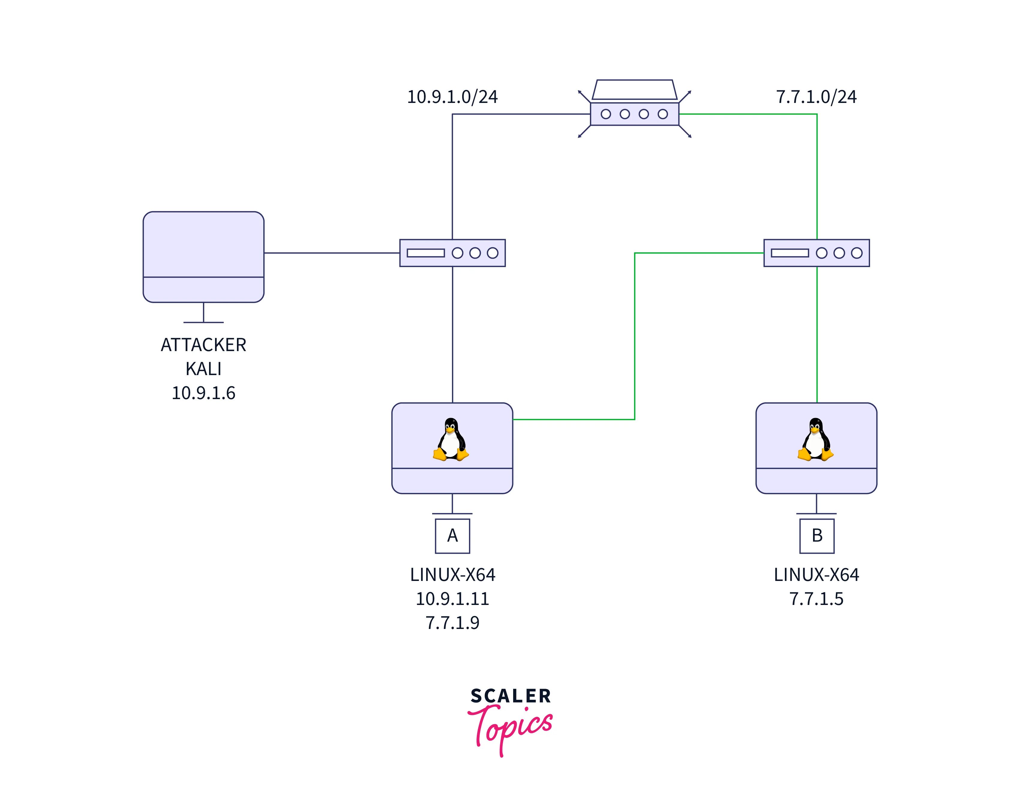 The scenario further states that the attacker wishes to access the subnet that is hidden behind the 7.7.7.0/24 interface. He has to pivot from a compromised host to do this.