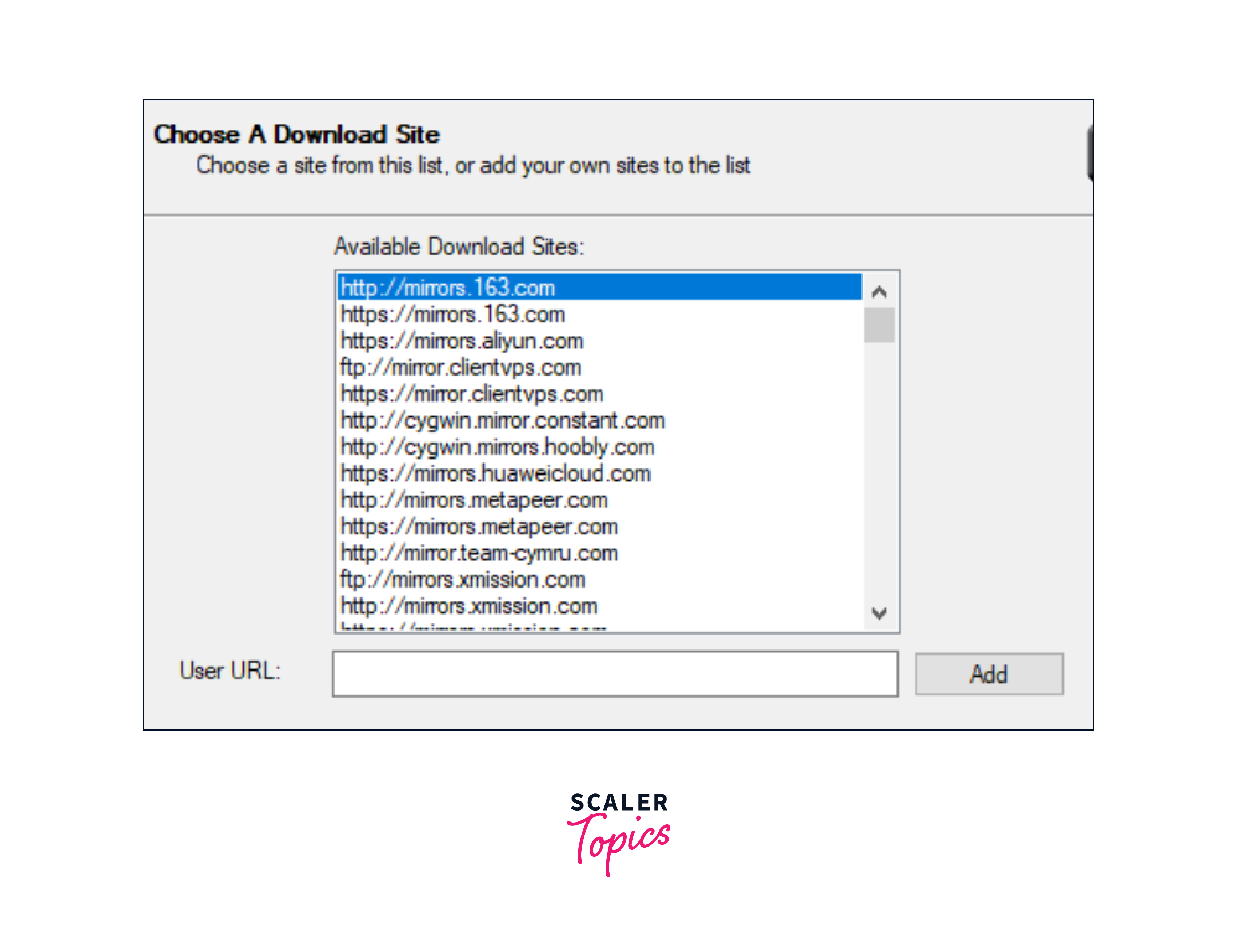 - Next, you'll be prompted to choose a mirror. This is where Cygwin will fetch its package files and if there's a mirror near your location that can provide a faster connection, select that. If you're not sure, any mirror from the list will work. Click "Next" to proceed.