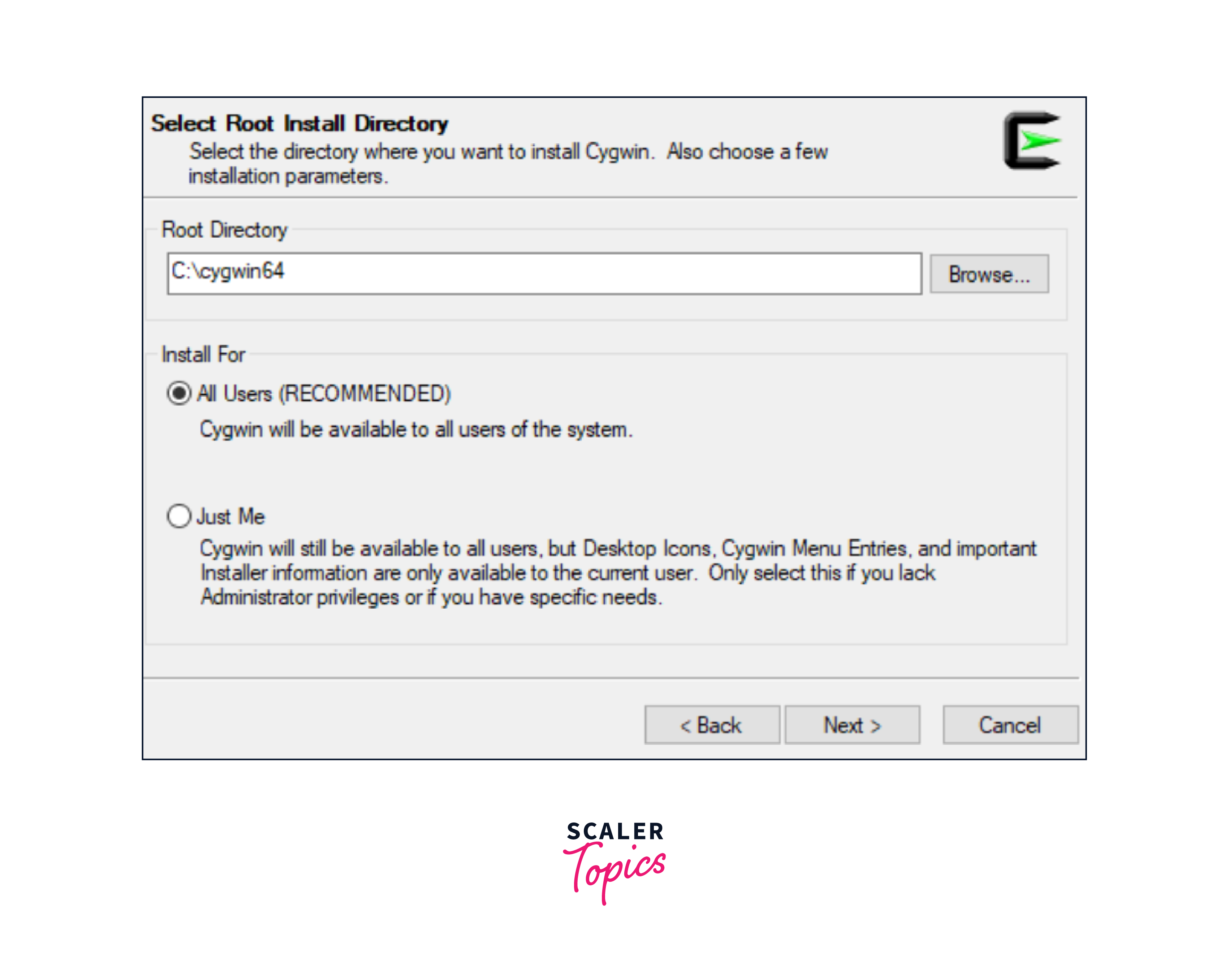 - You'll be asked about where to install Cygwin and whether it's for "All Users" or just you. Then, select "Next" to move forward.