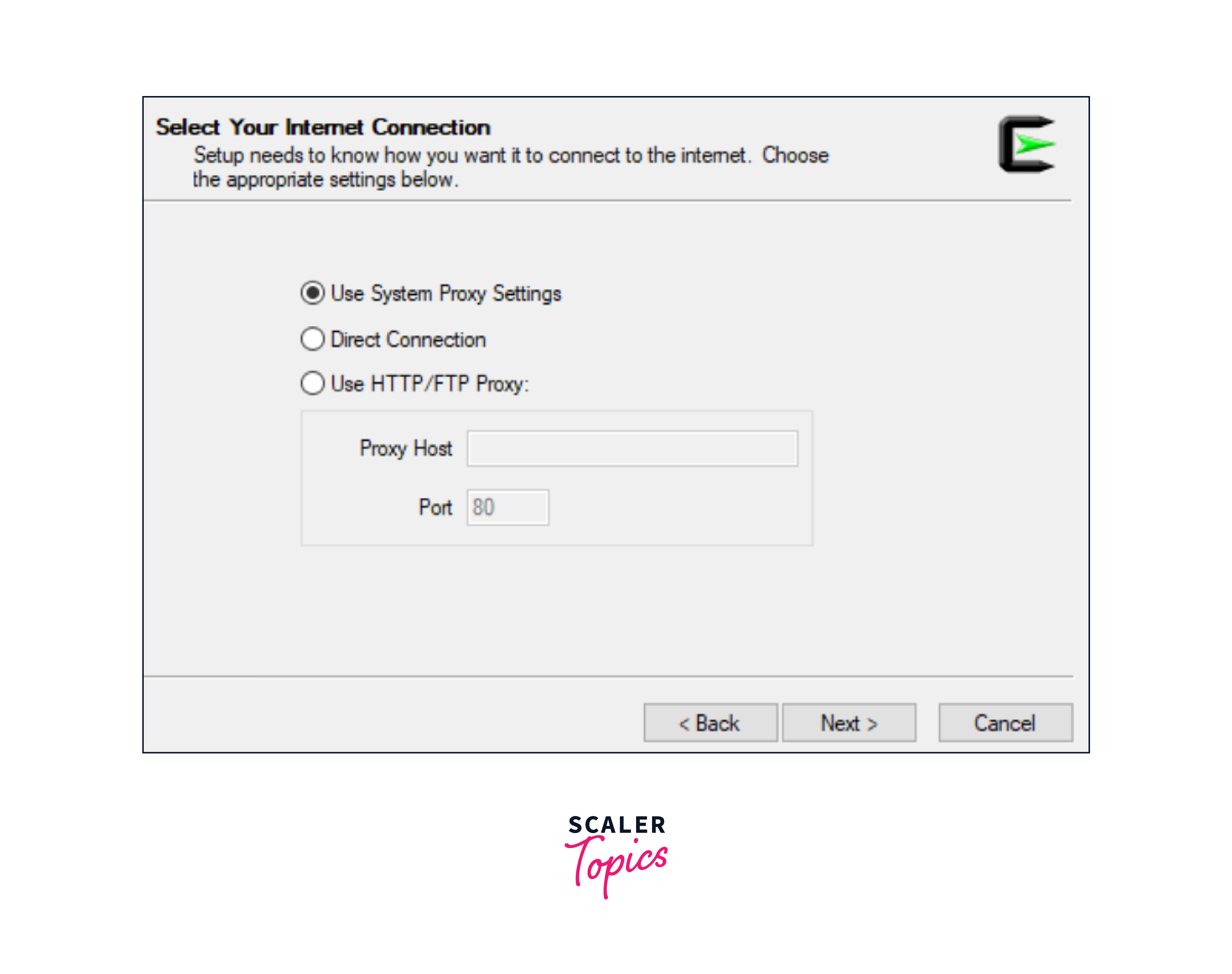 - For most situations, "Using System Proxy Settings" is good for downloading packages. But if you don't need a proxy and want to directly connect to the Internet, choose "Direct Connection." and just press the "Next" button to continue.