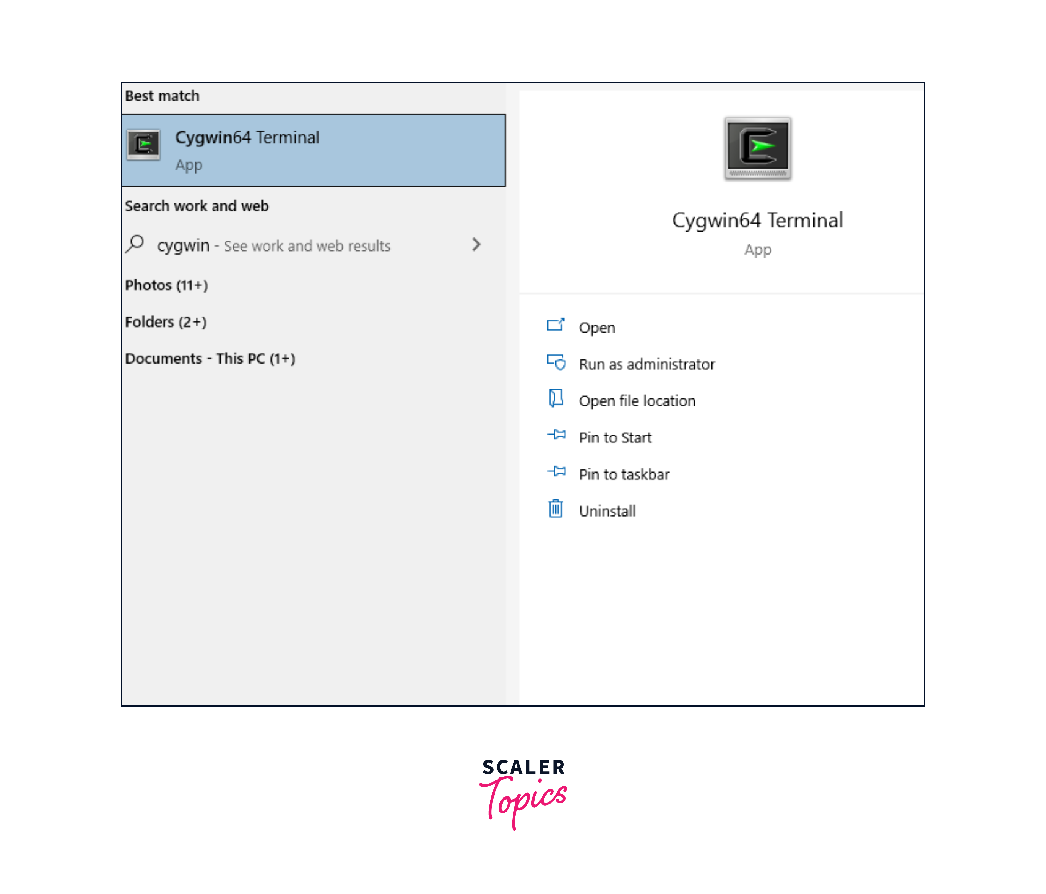 - You can now find and launch Cygwin by searching in the Start Menu, as shown below, or by double-clicking the Desktop icon if you created one during setup. This will open the Cygwin shell.