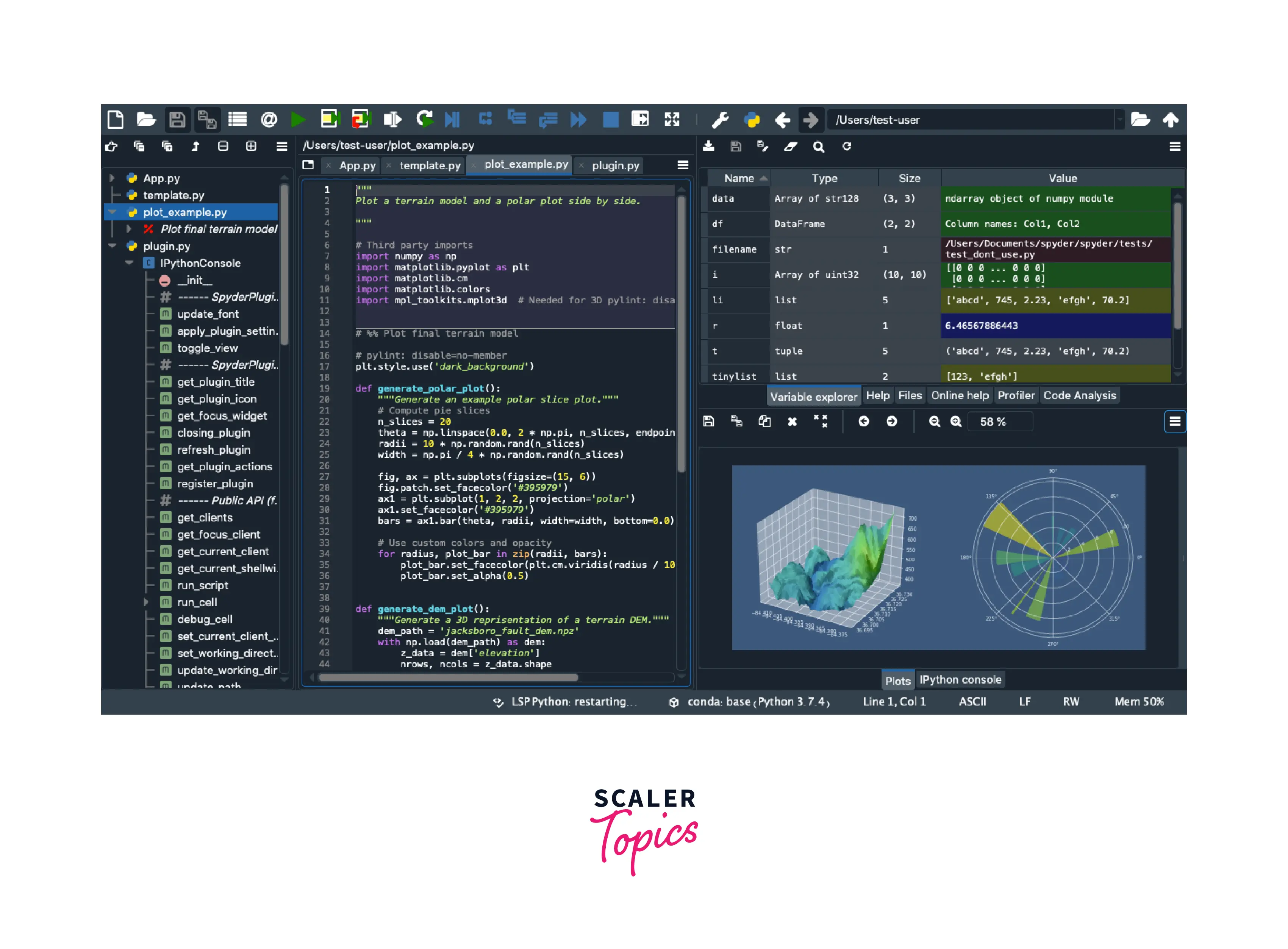 - It is designed specifically for scientific and data analysis applications and includes various tools and features that make it well-suited for these tasks. Some of the features of Spyder include - a code editor, interactive console, variable explorer, debugging, visualization, etc.