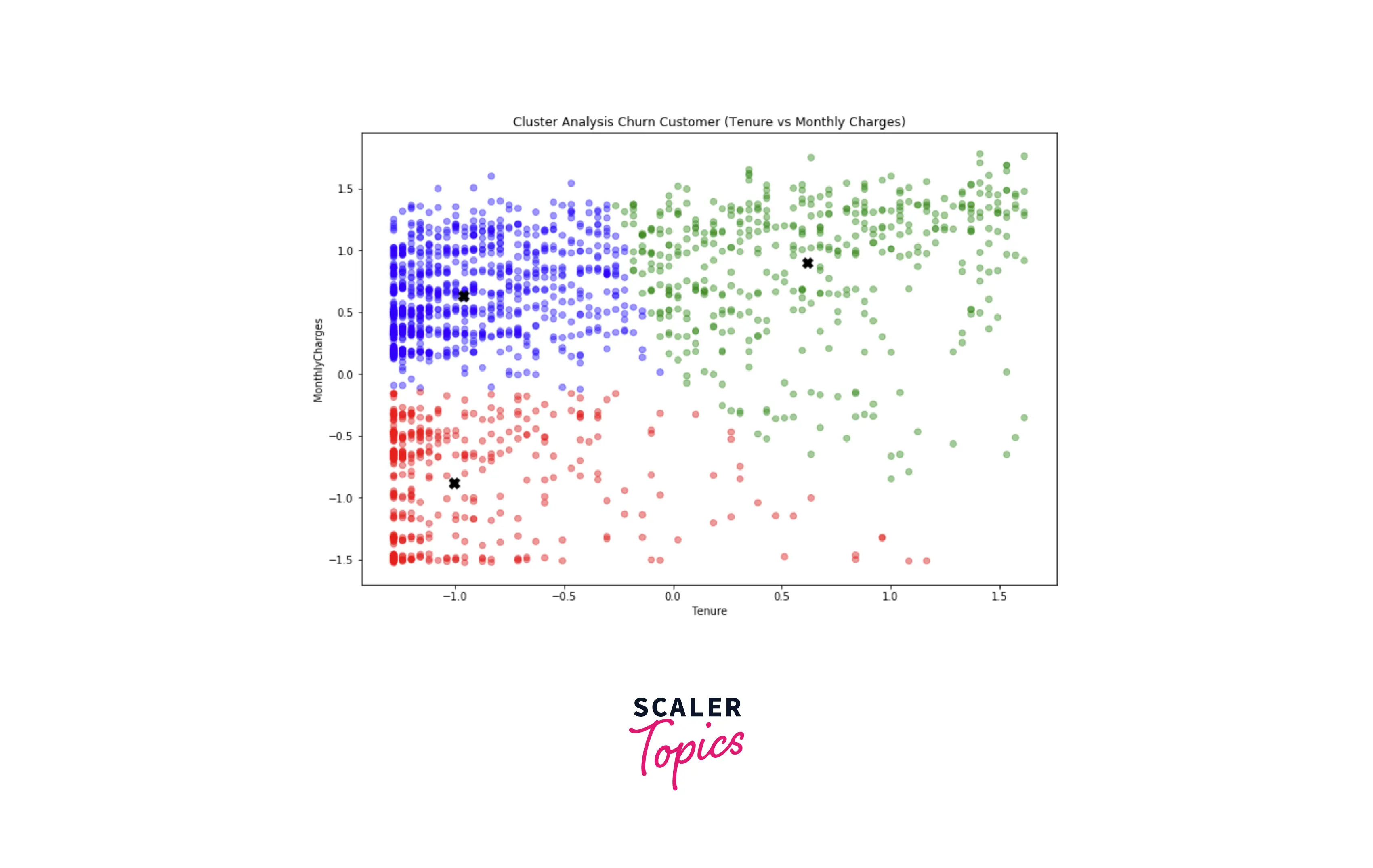 - Based on the elbow curve shown in the above figure, we can set the number of clusters to 3. Let’s cluster the customers into 3 groups based on tenure and monthly charges.