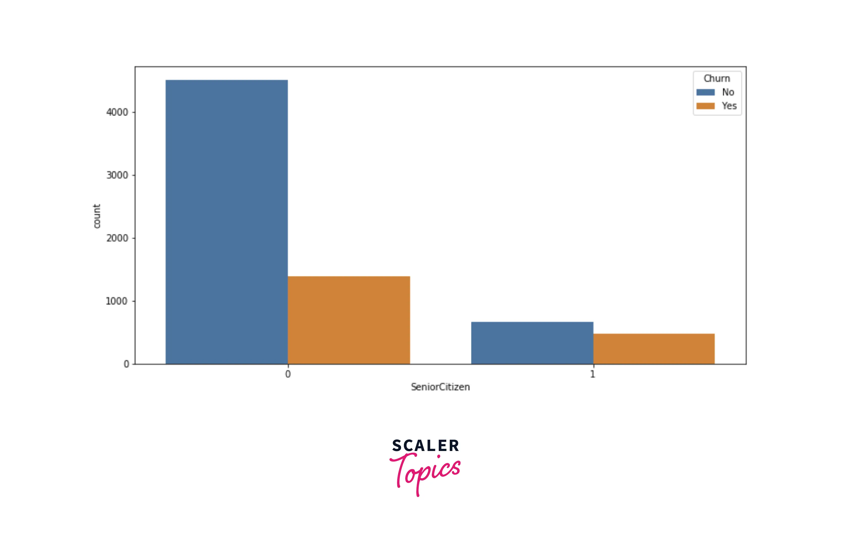 - Now, we will explore the distribution of the senior citizen class based on the target variable. As you can see below, senior citizens are likelier to churn than non-senior citizens.