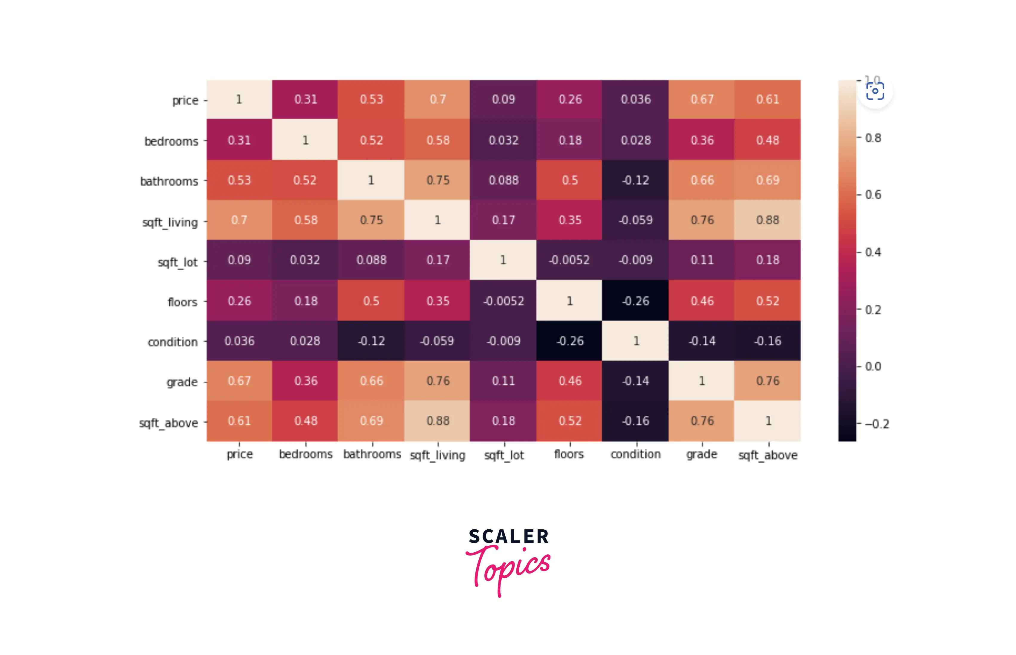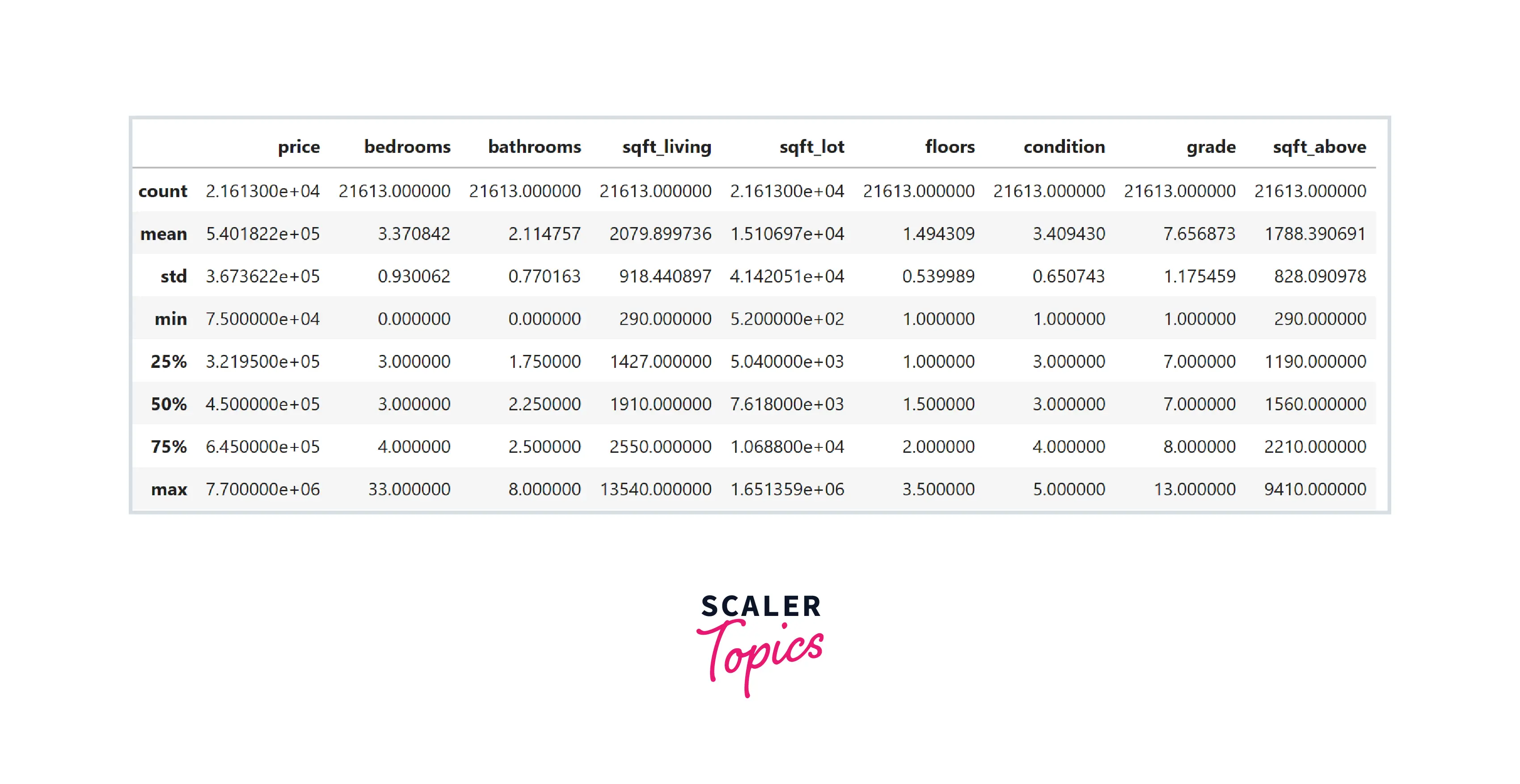 - As we can see, this dataset contains various features such as the number of bathrooms and bedrooms, total living, lot, and basement square feet area, the total number of floors, etc. Let’s explore the dataset by analyzing its summary statistics and correlation heatmap. For this, we will not use the zip code feature, as it is not really a number and is a categorical feature representing the house's location.