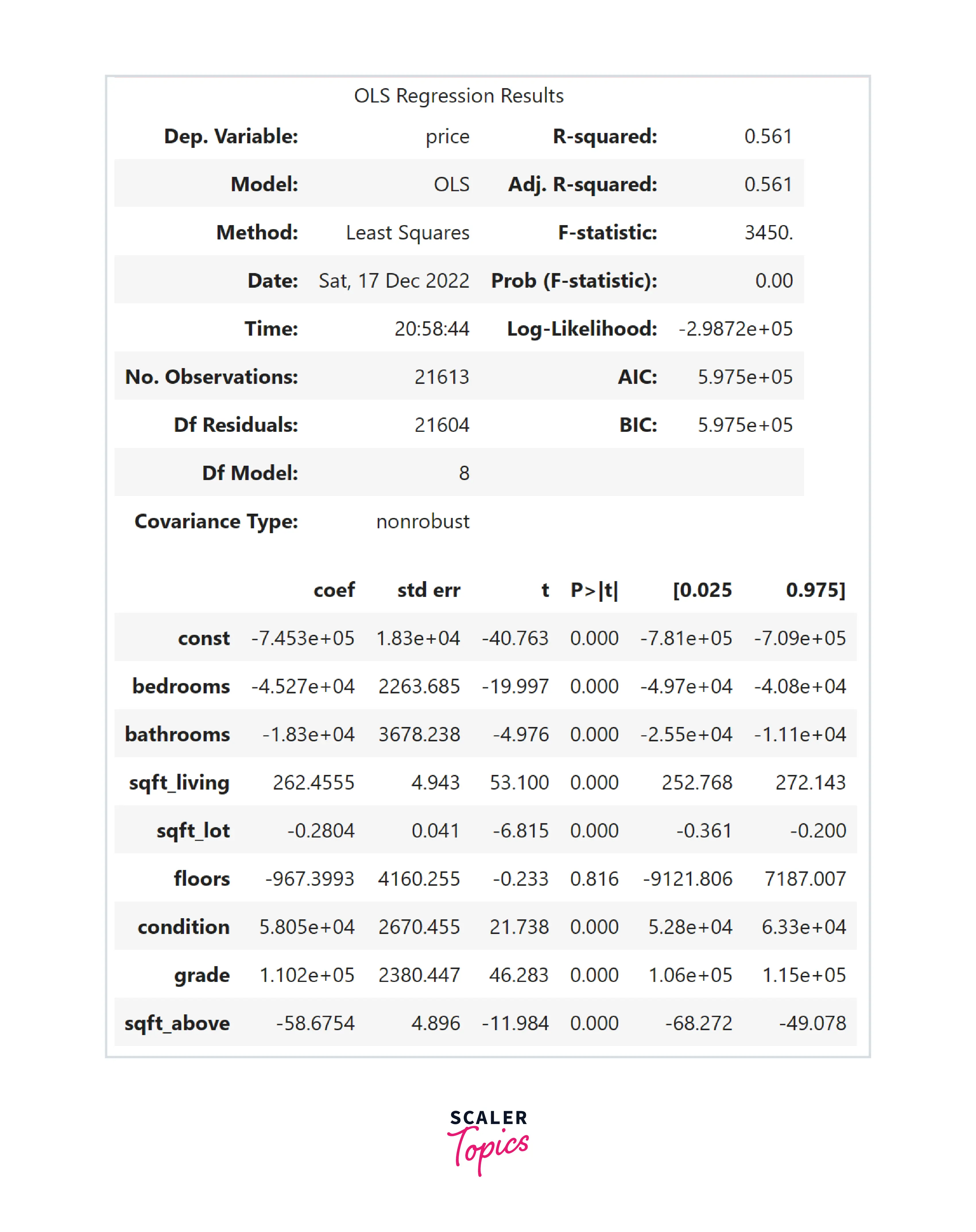 - For example, in our case, a 95% confidence interval for the coefficient of sqft_living feature is [252.7 - 272.1]. It means that for every increase in 100 sqft in this feature, there will be an increase of around 25000-27000 $ in the house price.