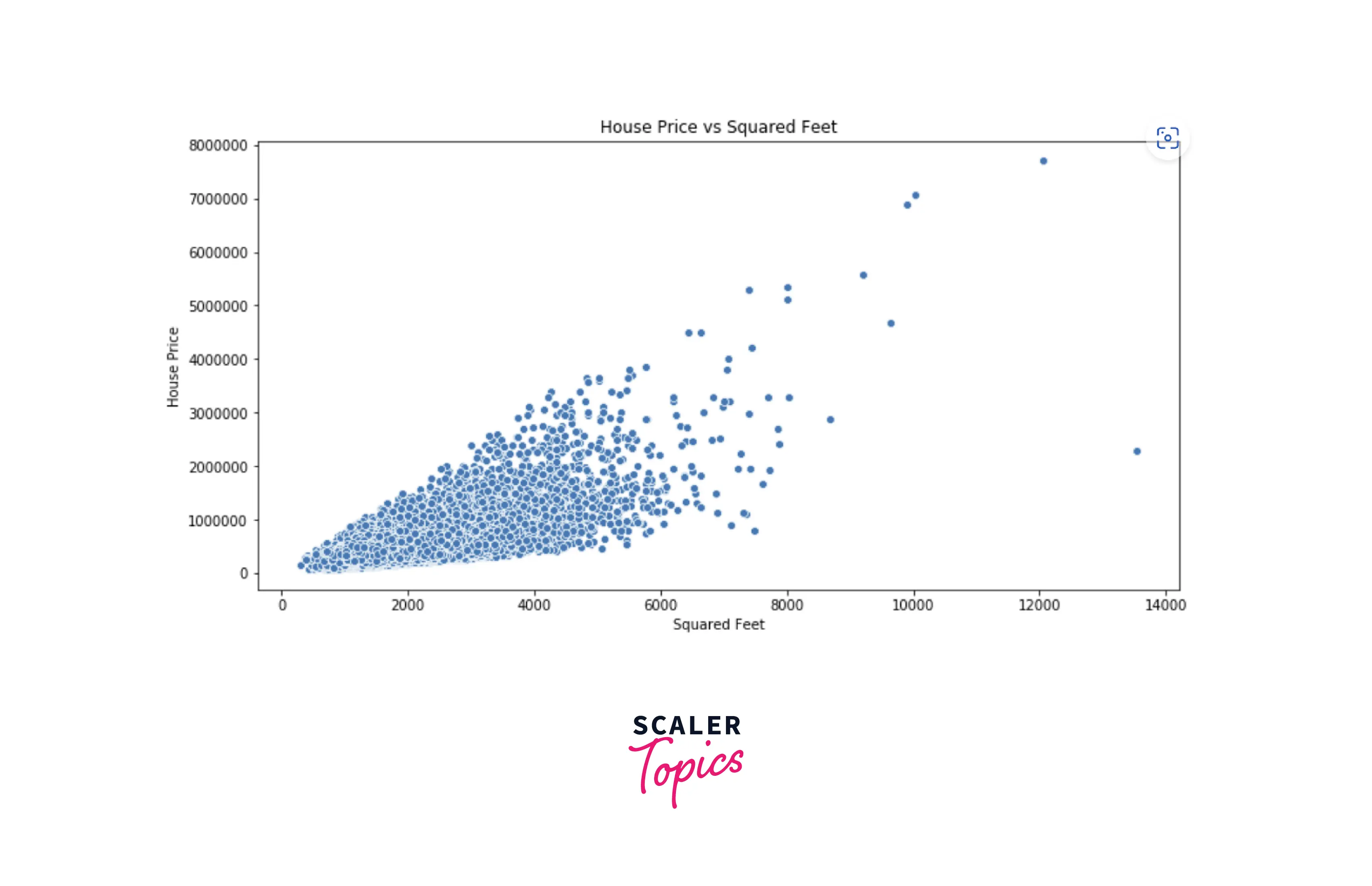 - Based on the correlation heatmap shown above, we can infer that sqft_living, grade, and bathrooms are the most correlated features with the dependent variable price. Let’s understand it better by plotting a scatter plot between sqft_living and price.