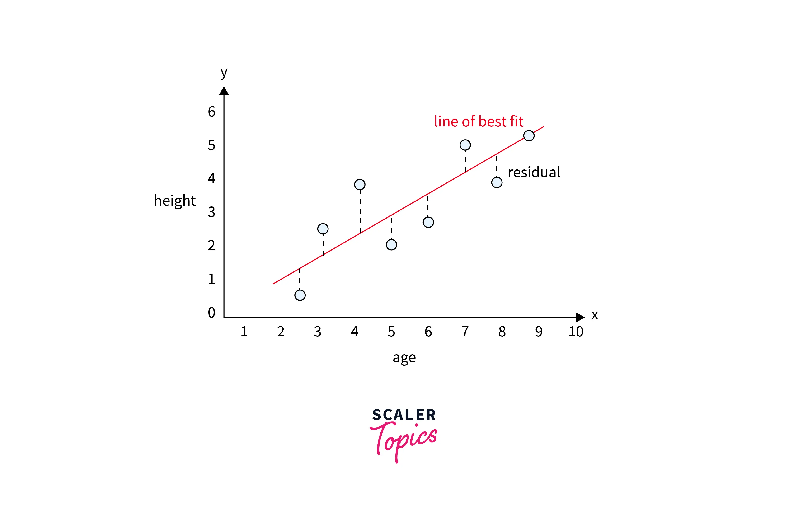 In this step, we need to estimate the unknown parameters of the linear regression model that can give us the best line fit of the relationship between variables. The best line fit is positioned in such a way that it minimizes the residuals of the model. Residuals are defined as differences between observed and predicted values of the model. The line of the best fit in a simple linear regression case will look as mentioned in the figure below.