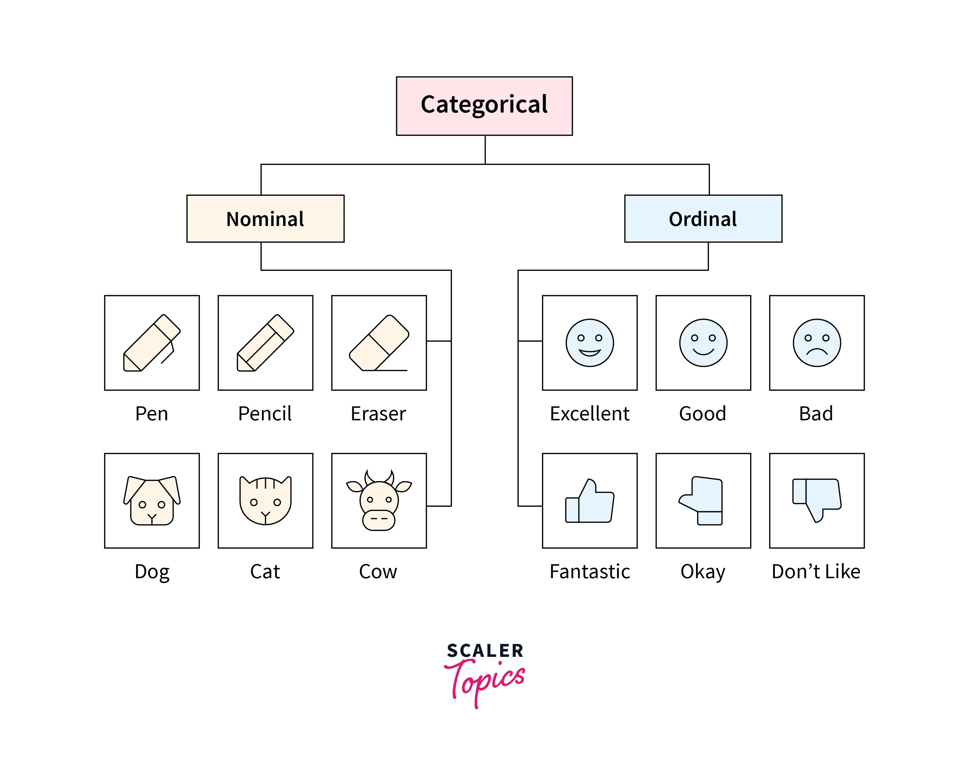Nominal Categorical Variable - Categories in nominal variables have no relationship with each other. For example, age (male, female, transgender), colors (blue, red, green, yellow), blood group (A+, B+, O+, O-), etc.