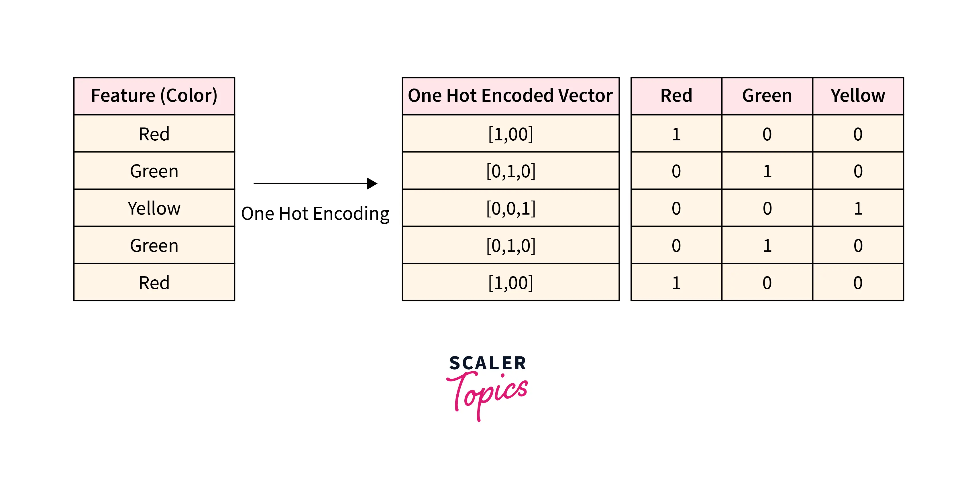 Let’s take an example to understand One Hot Encoding better. Suppose we have a categorical feature color, as mentioned in the below diagram, and it consists of 3 categories Red, Green, and Yellow. For each data point, One Hot Encoding will produce a numeric vector of length 3 and its ith value will be 1 representing ith category in the value set - (Red, Green, Yellow). For example, if the data point belongs to Red color, then One Hot Encoded vector would be [1,0,0] and it will be [0,1,0] and [0,0,1] if the data point belongs to Green or Yellow color respectively. The resulting vector can also be converted into multiple columns in the data frame, as shown on the right side of the below diagram.