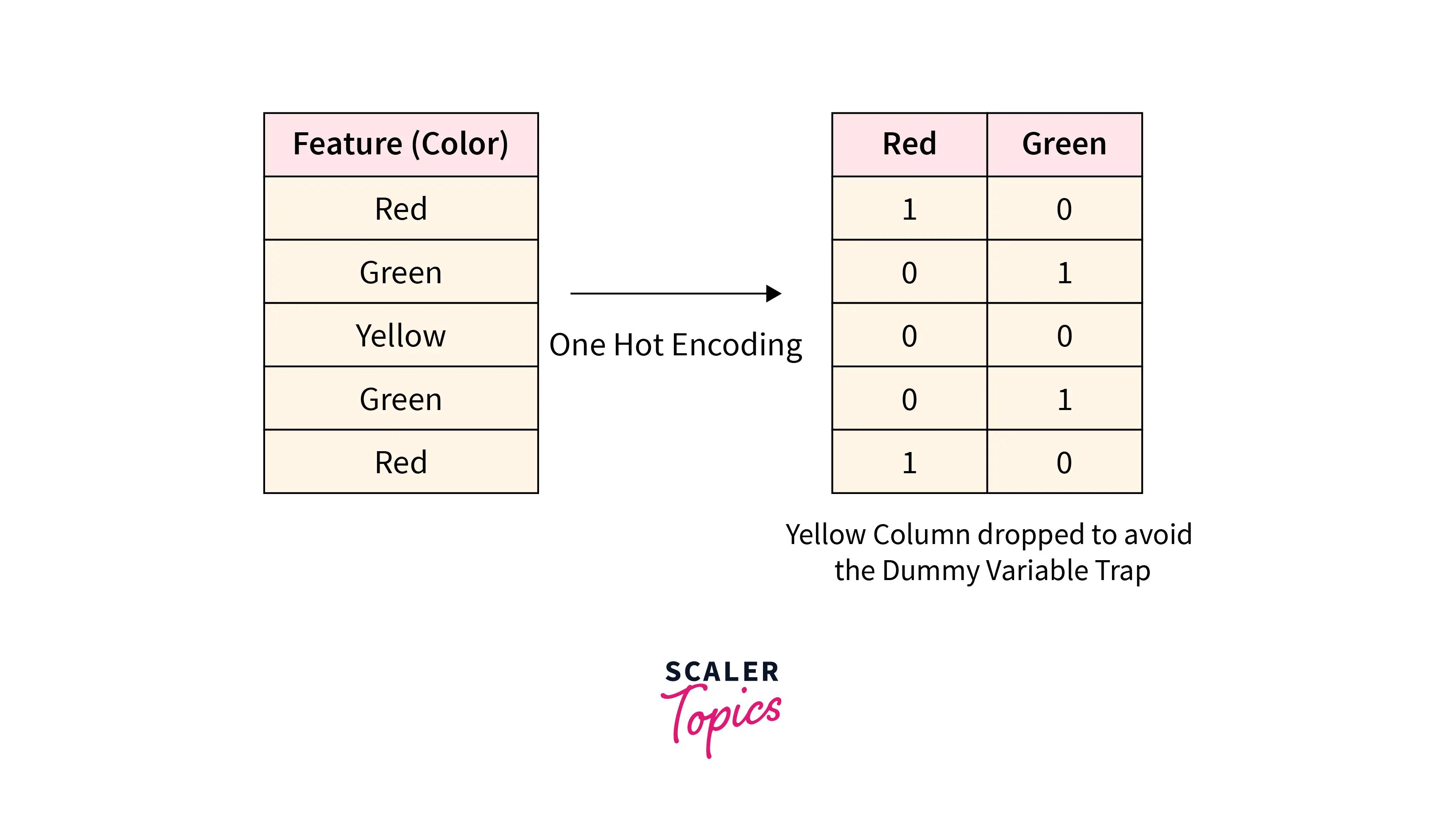 One Hot Encoding process will create new columns/attributes according to the number of categories present in the dataset. These attributes are called Dummy Variables, which are used as a proxy for categorical variables in ML models. This can result in the Dummy Variable Trap scenario, where newly created attributes are highly correlated to each other, and the outcome of one variable can be predicted by using other variables. This leads to multicollinearity, where input features are not independent of each other in a dataset, and it is a serious issue while training various regression models. To avoid the Dummy Variable Trap, we need to drop one dummy variable. So when One Hot Encoding produces n new columns/attributes, we can just use n-1 columns by dropping one redundant column. For example, in the above diagram, we can remove the Yellow column as it can be predicted by other columns. It is a redundant column, as we know that Yellow columns will have a 1 value when Red and Green columns are 0. So by dropping it, we can avoid the Dummy Variable Trap without affecting model accuracy.
