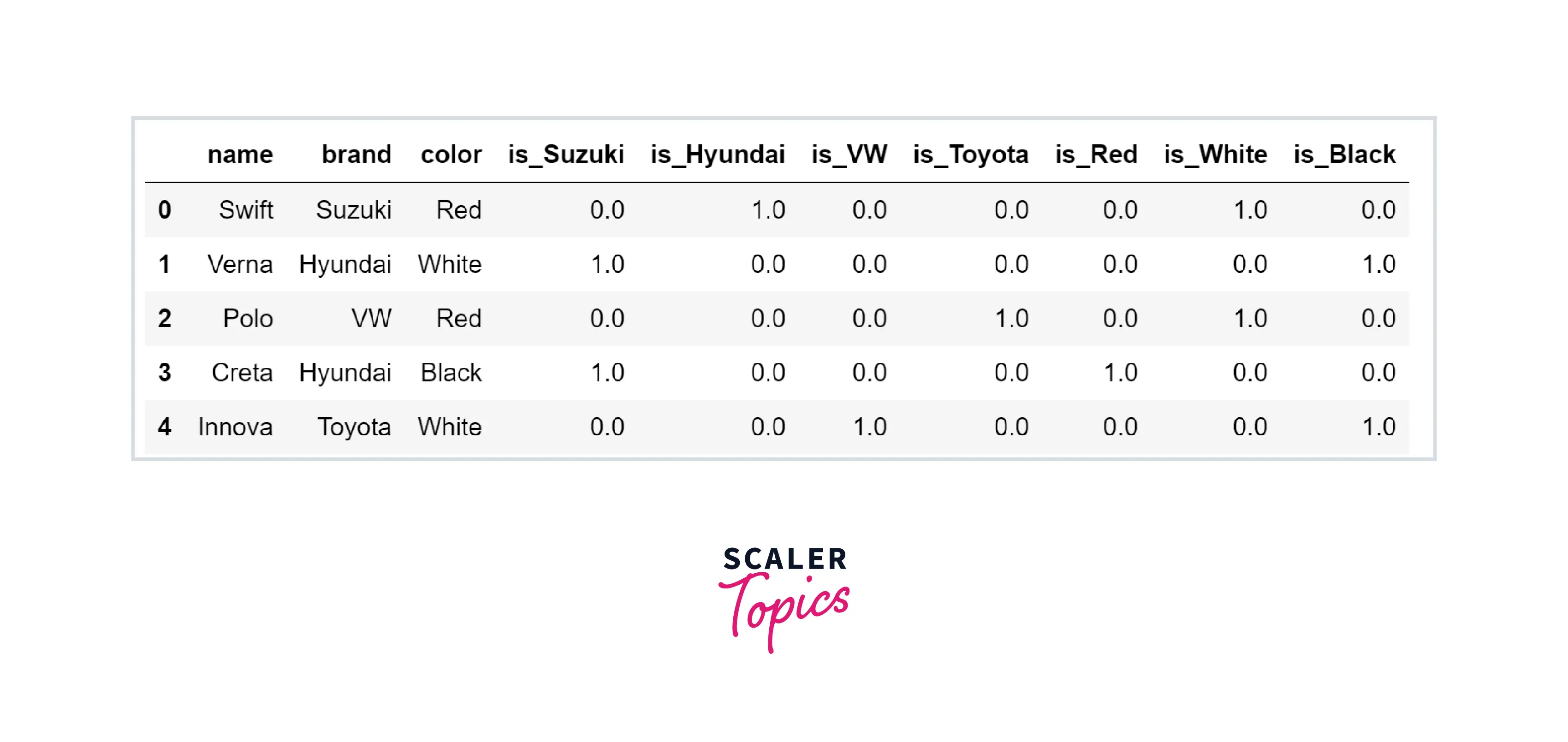 As you can see in the above implementation, that features brand and color were encoded, and new columns were created with the prefix is.